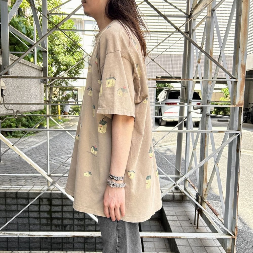 A printed T-shirt from the 1990s. Made by Rele Vant Products, a 90s brand that is likely to attract attention in the market in the future, this T-shirt features a mocha body with various shaped birdhouses, giving it a calm and classic look. XL size with a loose fit. As this is an old item, it may have aged slightly. Please check the photos and understand the characteristics of vintage items before purchasing.