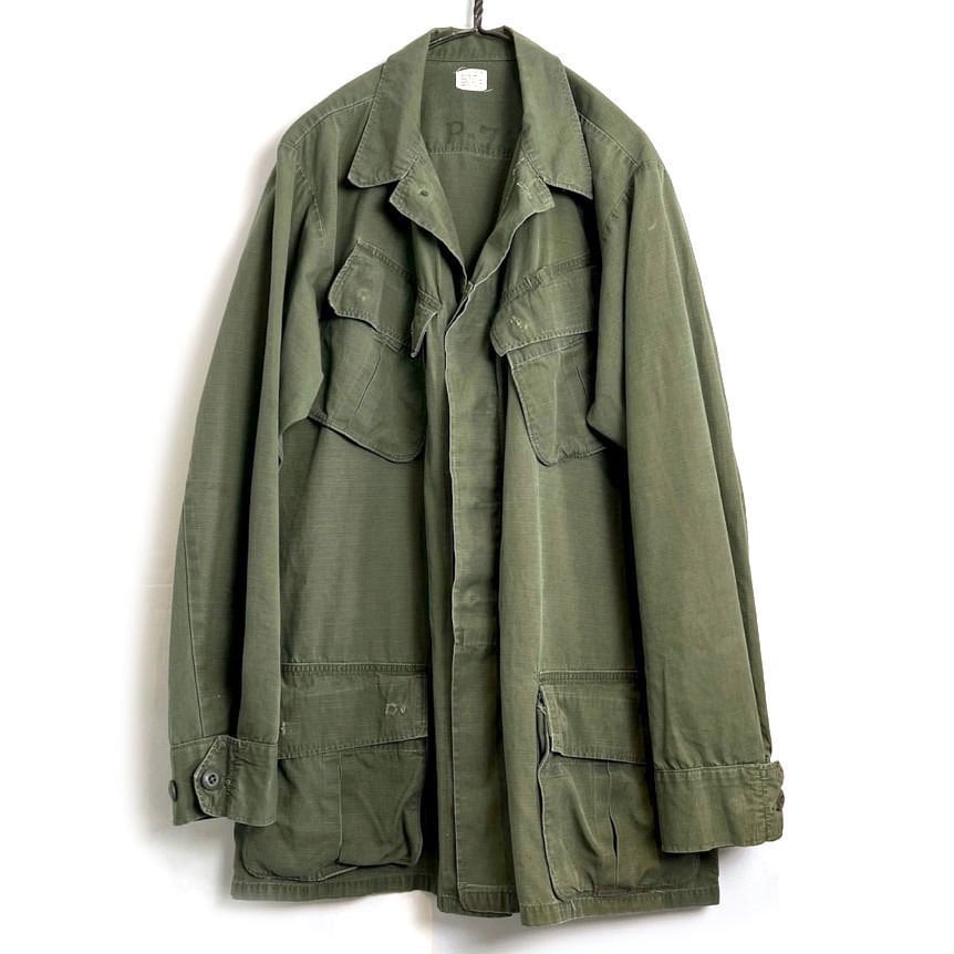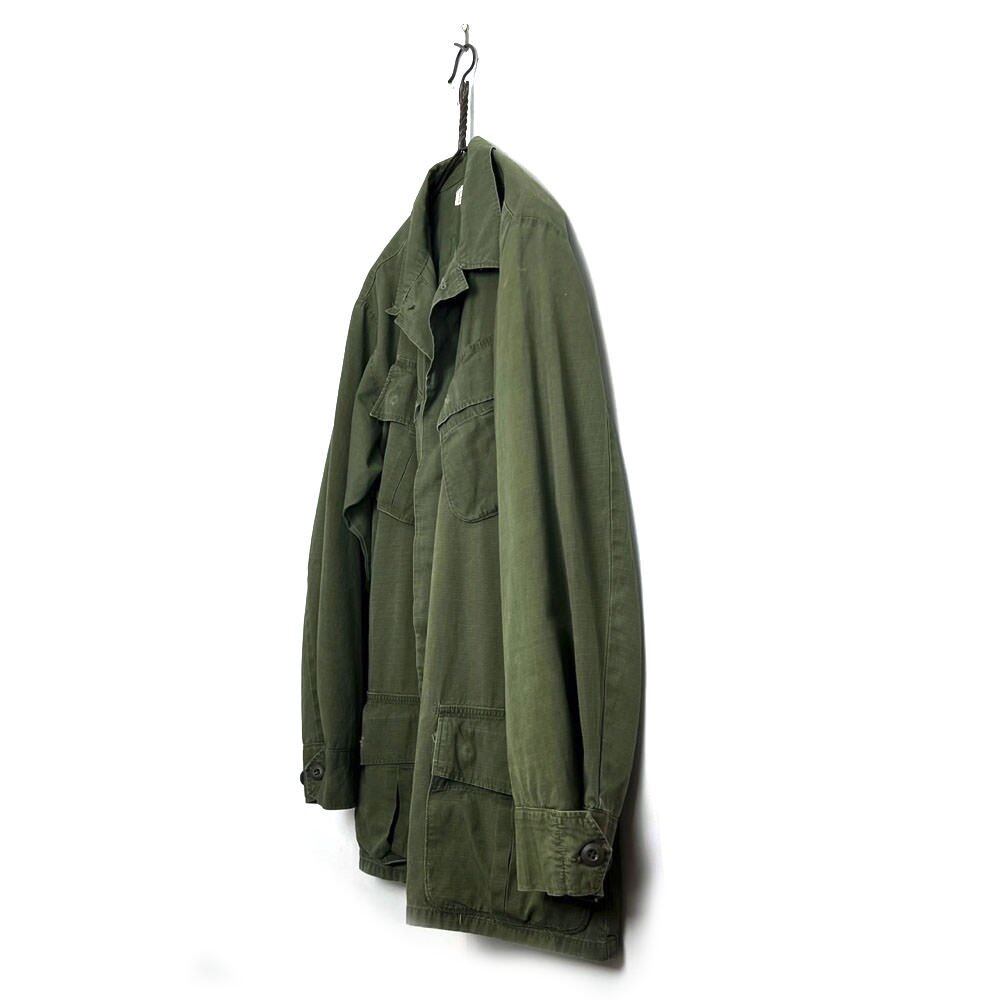 1969 US military jungle fatigue jacket. Olive color that has faded nicely over the years. Fabric has a worn texture. Size is medium-long. Not too big, but a good fit.