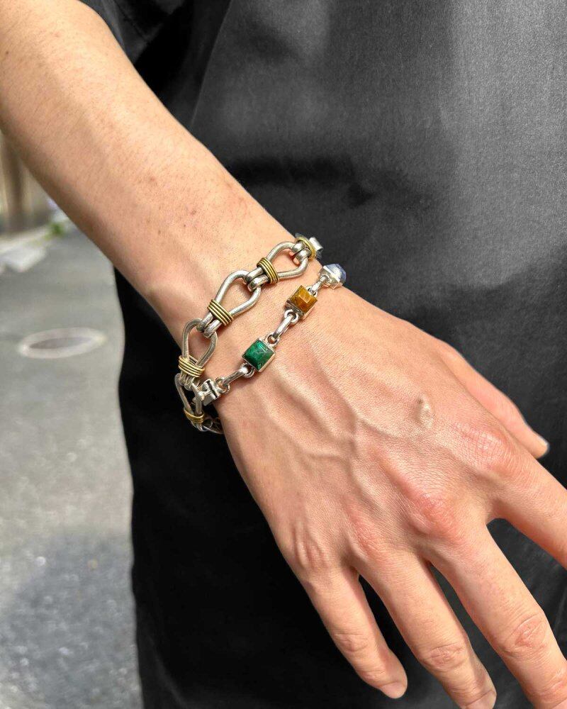Made in Taxco, Mexico, one of the worlds leading silver mining areas, where many silver artists and craftsmen have gathered since ancient times. This vintage piece has been attracting attention in recent years for its unique evolution, with designs that range from Aztec native elements to Native American jewelry with influences from the American Southwest, and sophisticated Scandinavian minimalist designs. The design is pop and silver, with various gemstones set into the sterling body, giving it a classy yet subtle presence. This is a square-shaped piece that looks more mannish, with more minerals used than normal pieces, such as onyx, azurite, malachite, and tiger eye, for an impressive design. . 925 silver, stamped Taxco, Mexico. Since it is an old item, there are scratches, etc. Please check the photos and understand the characteristics of vintage before purchasing.