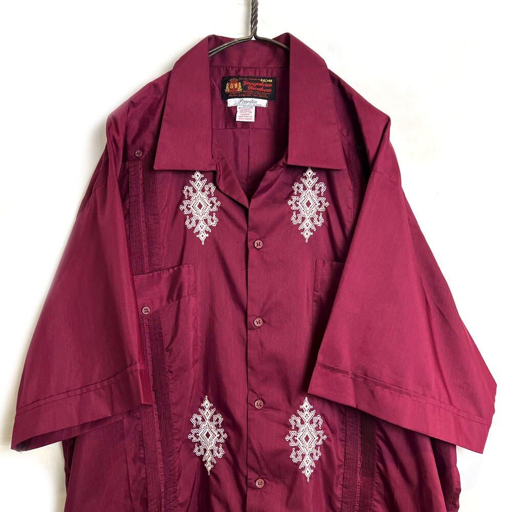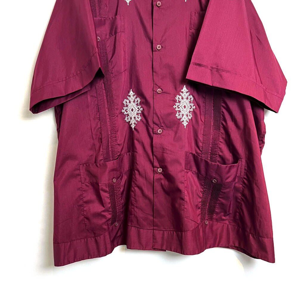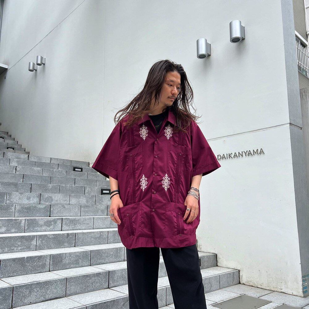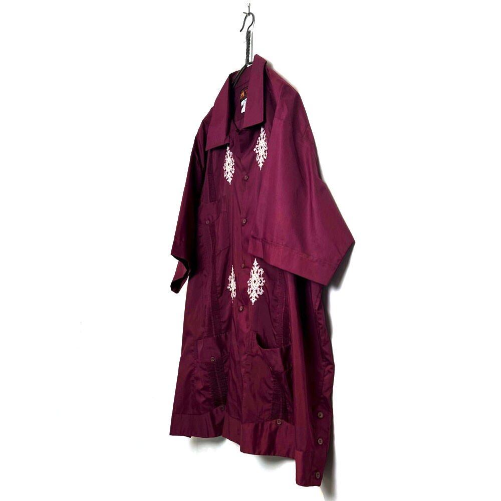 The 4XL size has a voluminous oversized silhouette and can be worn with a shirt-like outerwear feel. The polyester x cotton fabric is light and smooth to the touch. The burgundy color has a lustrous sheen.