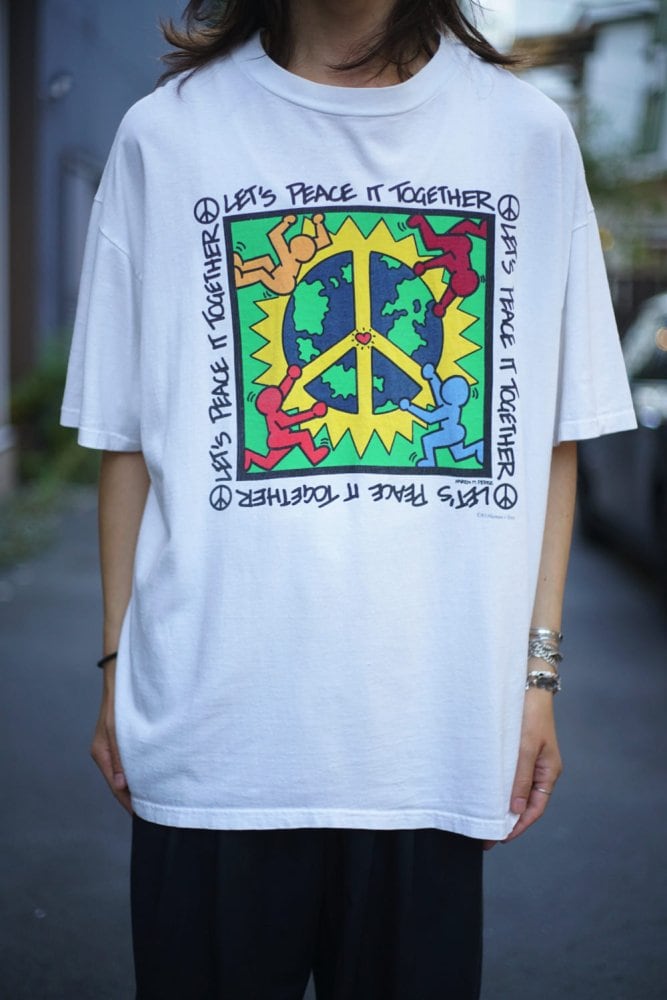 This is an art T-shirt titled LETS PEACE IT TOGETHER by artist Karen M Perez, made in 1993 and inspired by Keith Haring.