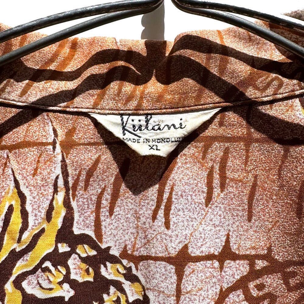 This cotton aloha shirt is made by Kiilani, a brand that was sold at SEARS, JCPenney, and other stores around the 1950s.