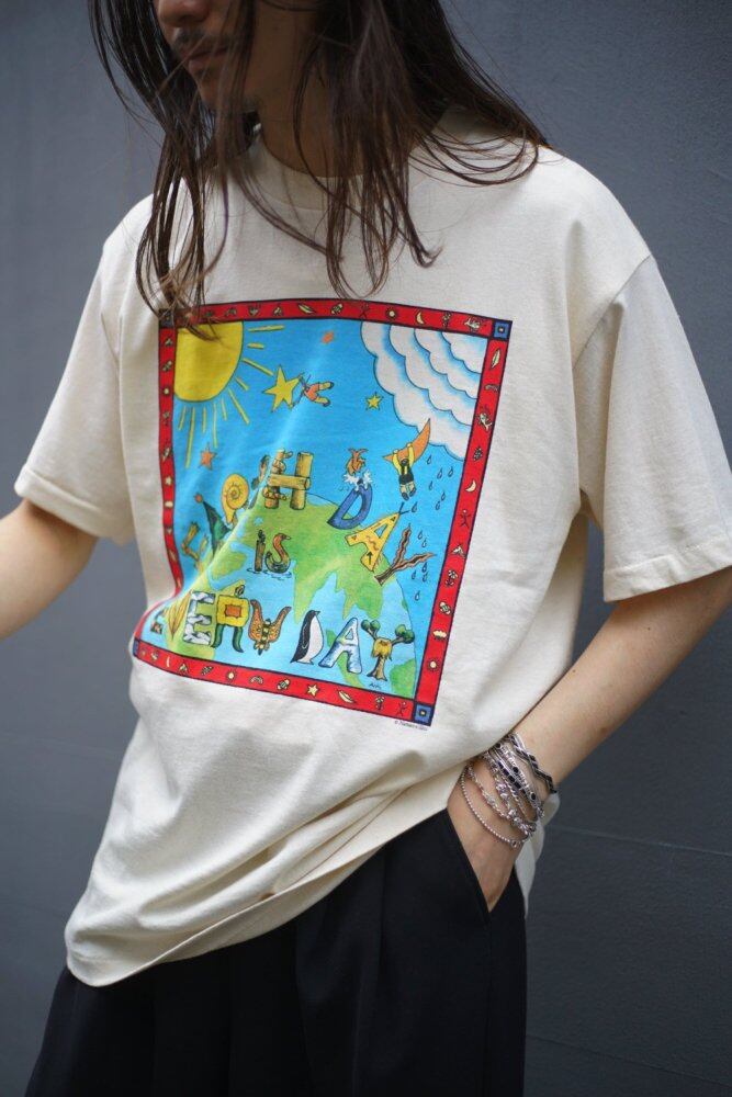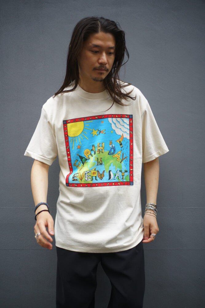 This is a printed T-shirt from Human-i-Tees, known since the 1990s for its designs raising awareness of environmental issues.<BR> The retro coloring, pop design, and beige body give it an organic feel, creating a natural look.