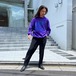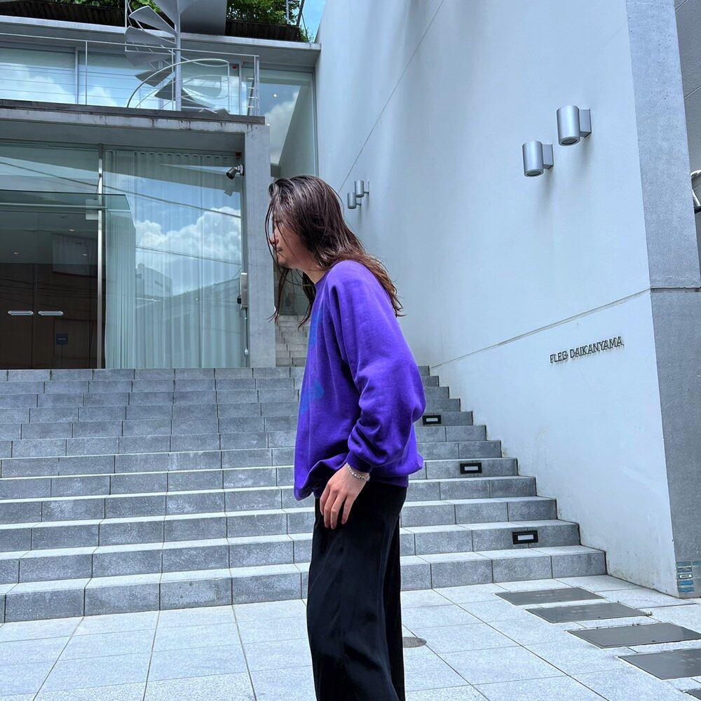 A sweatshirt from the 80s. The sweatshirt fabric has become soft and worn over the years, and the fabric has a moderately thin and comfortable feel. The purple color and blue fish art create a nice atmosphere. The size is XL, and the vintage sweatshirt has a good fit with a moderate amount of room.