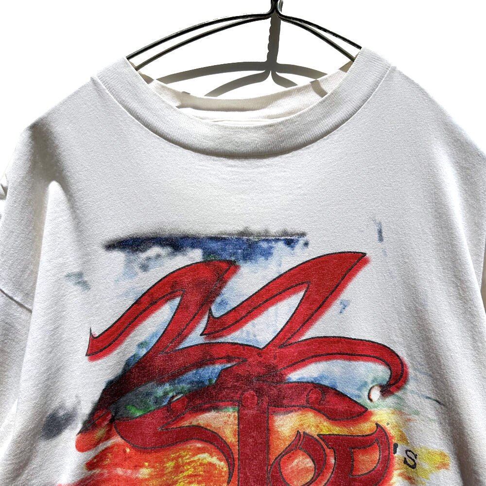 This is a 1997 tour promotion T-shirt from the blues rock band, ZZ Top.<BR> The print design is related to the 1996 album Rhythmeen, and the graffiti-like artistic design stands out against the white body.