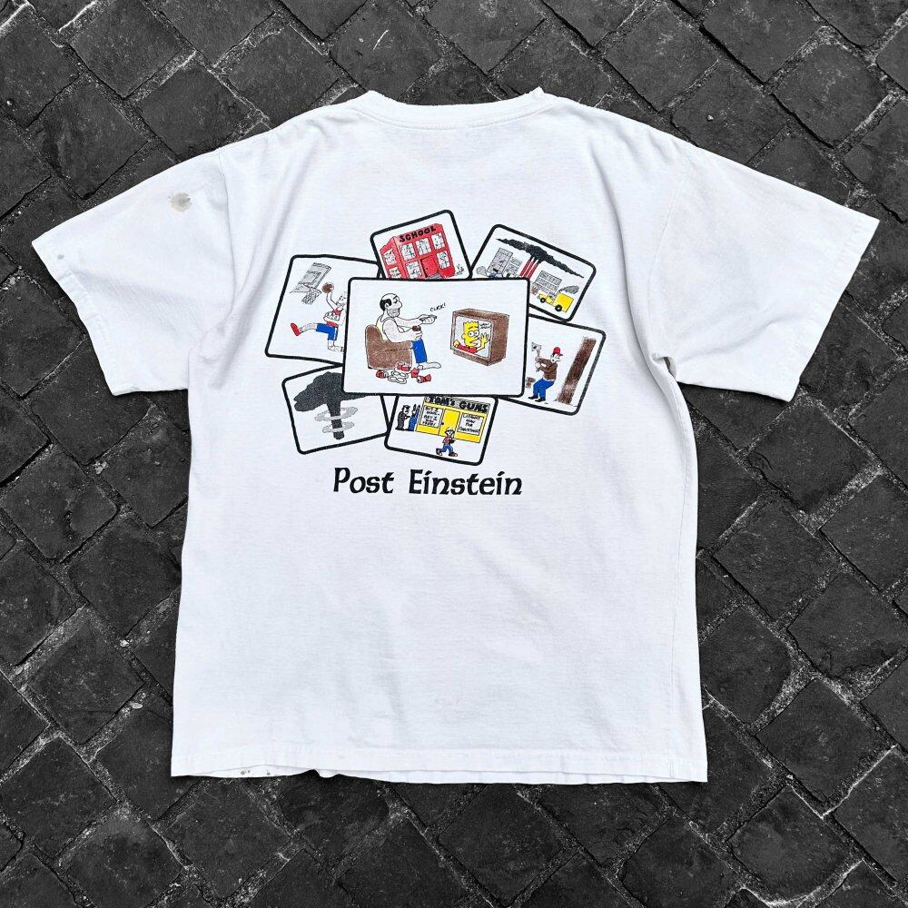 This art T-shirt features an excellent comic design that satirizes the evolution of humans and the evolution of civilization. It is rare to see a vintage T-shirt with such a high level of design, with detailed depictions and large prints that make an impact on both the front and back. This is a piece with a nice aged look overall. It is probably a size L with a loose silhouette. Since it is an old item, it may have aged slightly. Please check the photos and understand the characteristics of vintage items before purchasing.