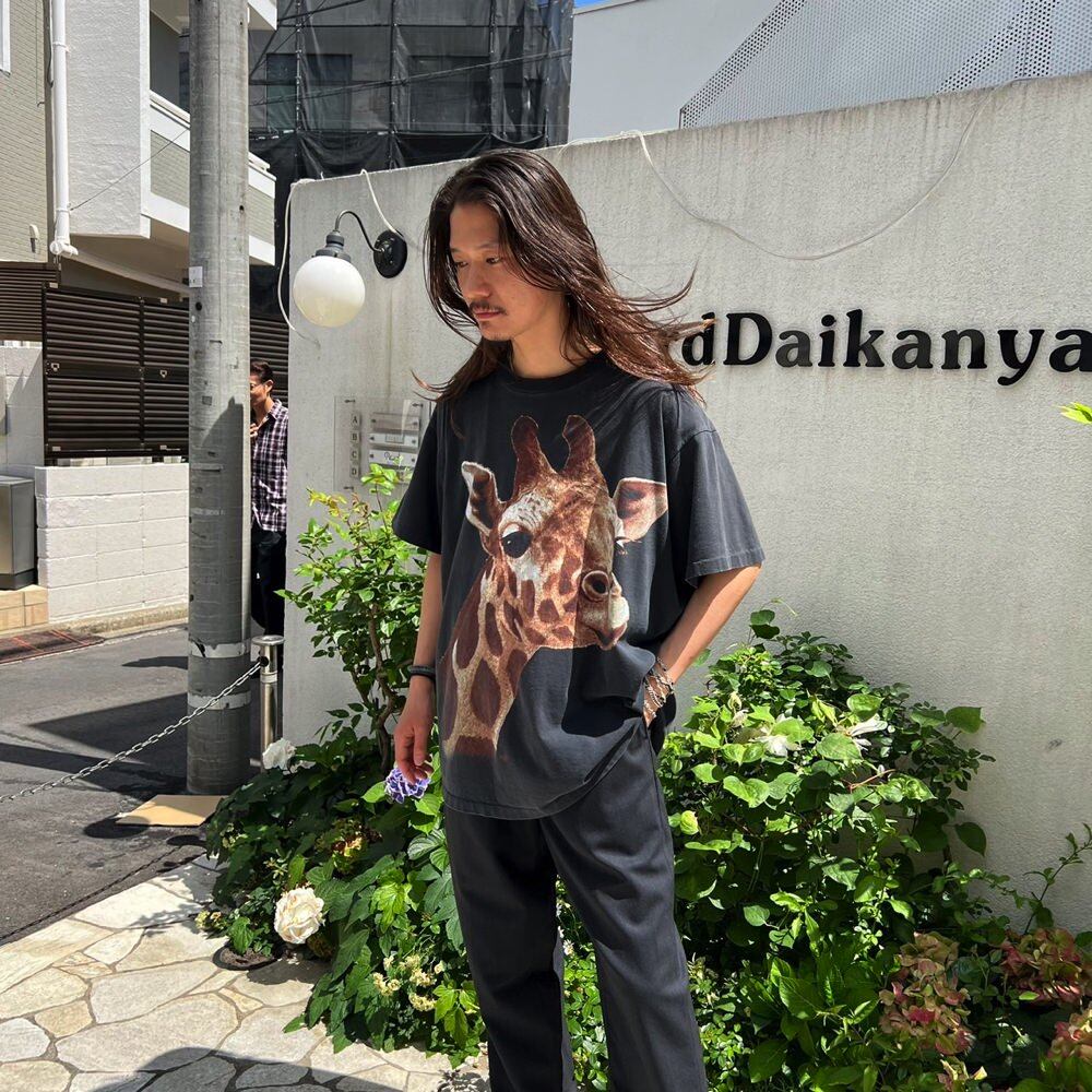 90s animal print T-shirt with a huge giraffe face printed on it. A loose fit 100% cotton body. Faded black color.