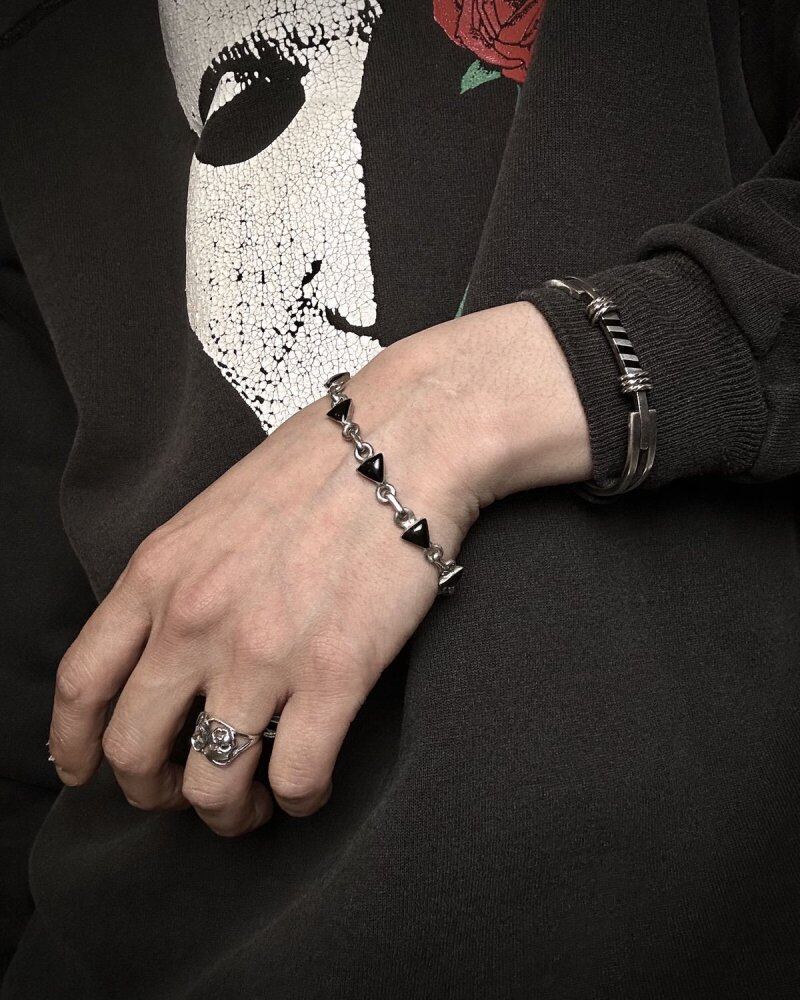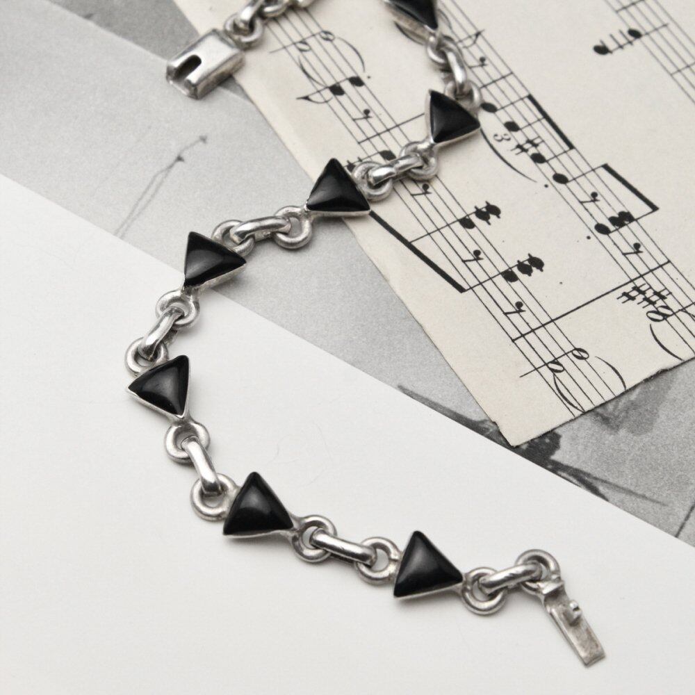 Made in Taxco, Mexico, one of the worlds leading silver mining areas, where many silver artists and craftsmen have gathered since ancient times. This vintage piece has been attracting attention in recent years for its unique evolution, with designs that range from Aztec native elements to Native American jewelry with influences from the American Southwest, and sophisticated Scandinavian minimalist designs. This piece has a small triangular part inlaid with onyx, giving it a minimalist and light impression with a strong contrast. The angular design gives it a presence without being too calm. Stamped with Mexico-Tasco 925 silver. As it is an old item, there are scratches, etc. Please check the photos and understand the characteristics of vintage items before purchasing.
