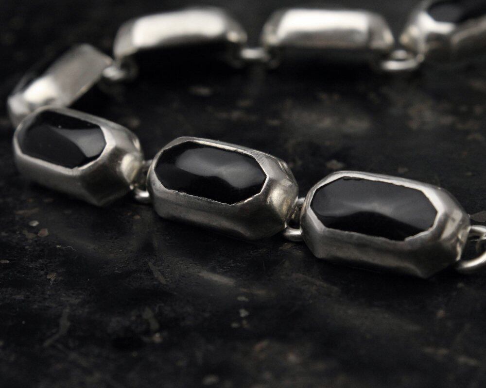 Made in Mexico, one of the worlds leading silver mining areas, where many silver artists and craftsmen have gathered since ancient times. This vintage piece has been attracting attention in recent years for its unique evolution, with designs that range from Aztec native elements to Native American jewelry with influences from the American Southwest, and sophisticated Scandinavian minimalist designs. This is a very rare design in which onyx is inlaid into rectangular round parts, and the onyx inside has corners in an octagonal shape. This piece has a minimalist yet heavy and mannish look. Stamped Mexico-Plata (silver) 925. As it is an old item, there are scratches, etc. Please check the photos and understand the characteristics of vintage before purchasing.