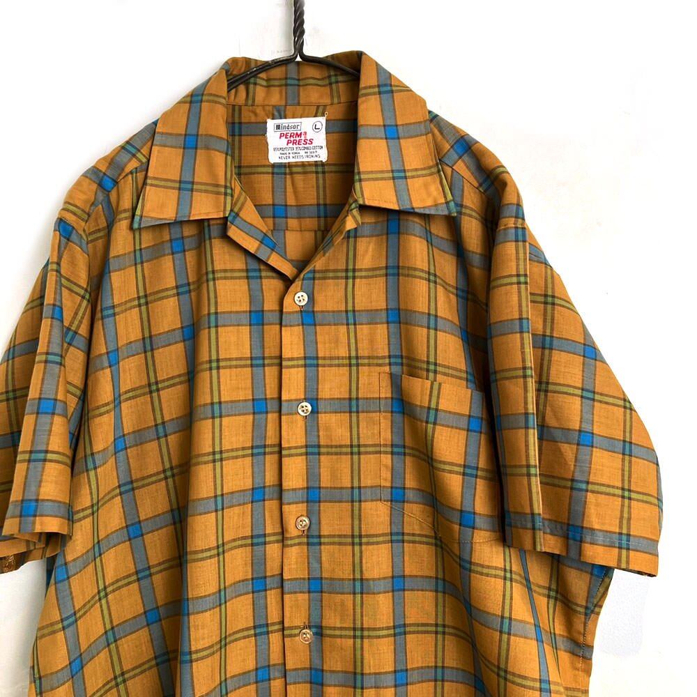 A short-sleeved shirt from the 70s. A vintage check shirt with a khaki base color and pale blue and green checks for an earthy feel. Made of polyester and cotton with a light, smooth texture.