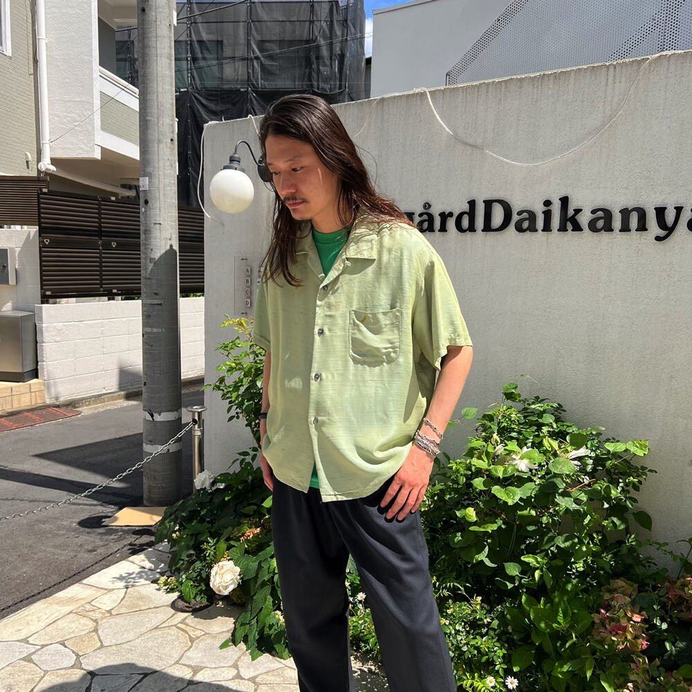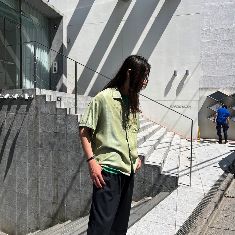 A 60s loop collar rayon shirt with a cool color scheme of pale mint green and sax blue ikat. Made of lustrous rayon satin fabric with an exquisite soft feel. The size is L, and it is a good piece with a moderately loose fit.