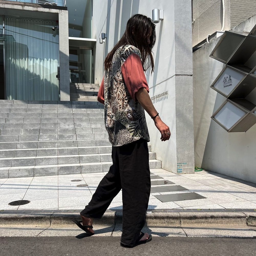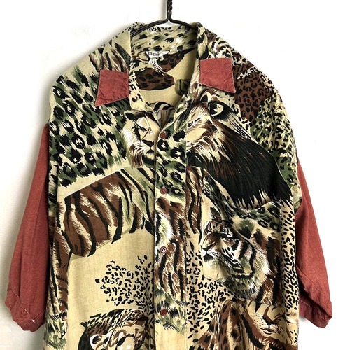 A short-sleeved rayon shirt from the 90s. It features a camouflage-like animal pattern of leopard, lion and zebra, and both sleeves and the tip of the collar are switched to terracotta colored plain fabric.