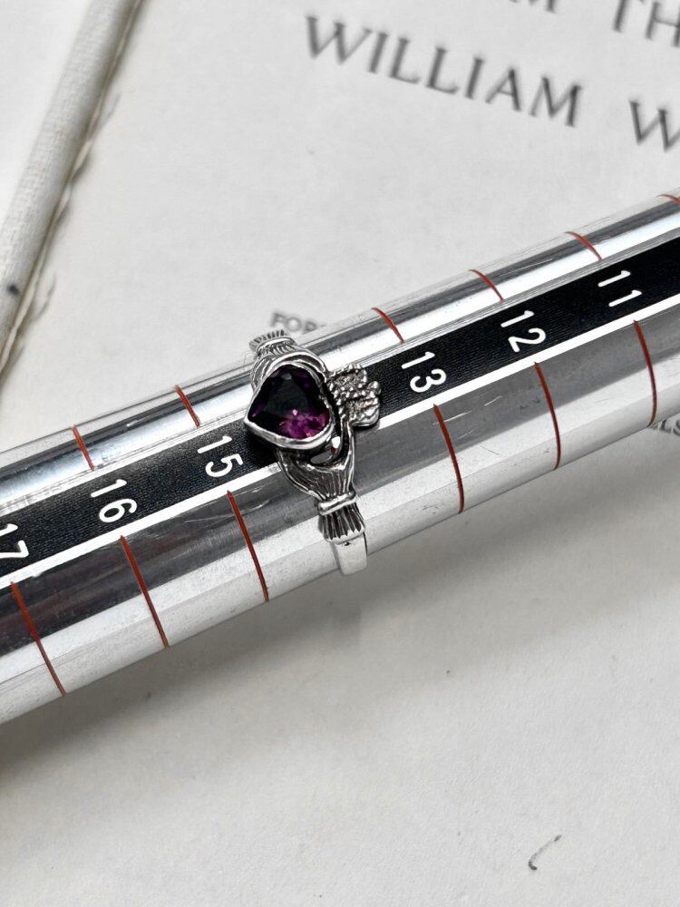 The Claddagh ring is a traditional piece of jewelry that originated in Ireland and has been made for centuries. The motifs of the heart, crown, and hand represent love, loyalty, and friendship. It is said to have various meanings depending on the finger on which it is worn, regardless of gender. Its small size and design make it a subtle piece that looks neat. It has an elegant amethyst color top and is stamped 925. Please check the condition in the photos and understand the characteristics of vintage items before purchasing.