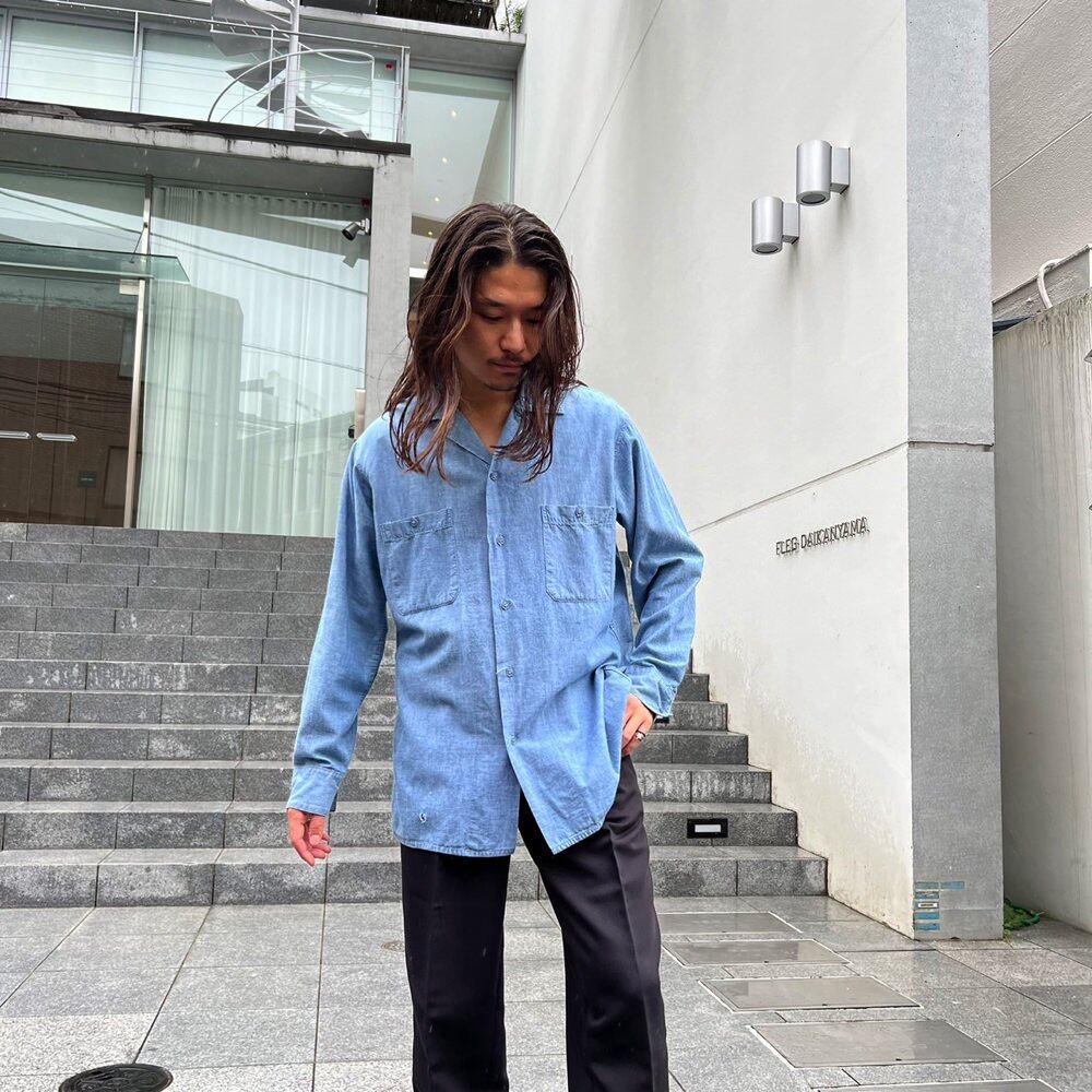 A 1970s US Navy chambray shirt. Made of 100% cotton chambray that has softened over time. The faded light blue color is also nice. The size is listed as 15.5, but it feels like an L size when worn. It has a nice, relaxed silhouette.