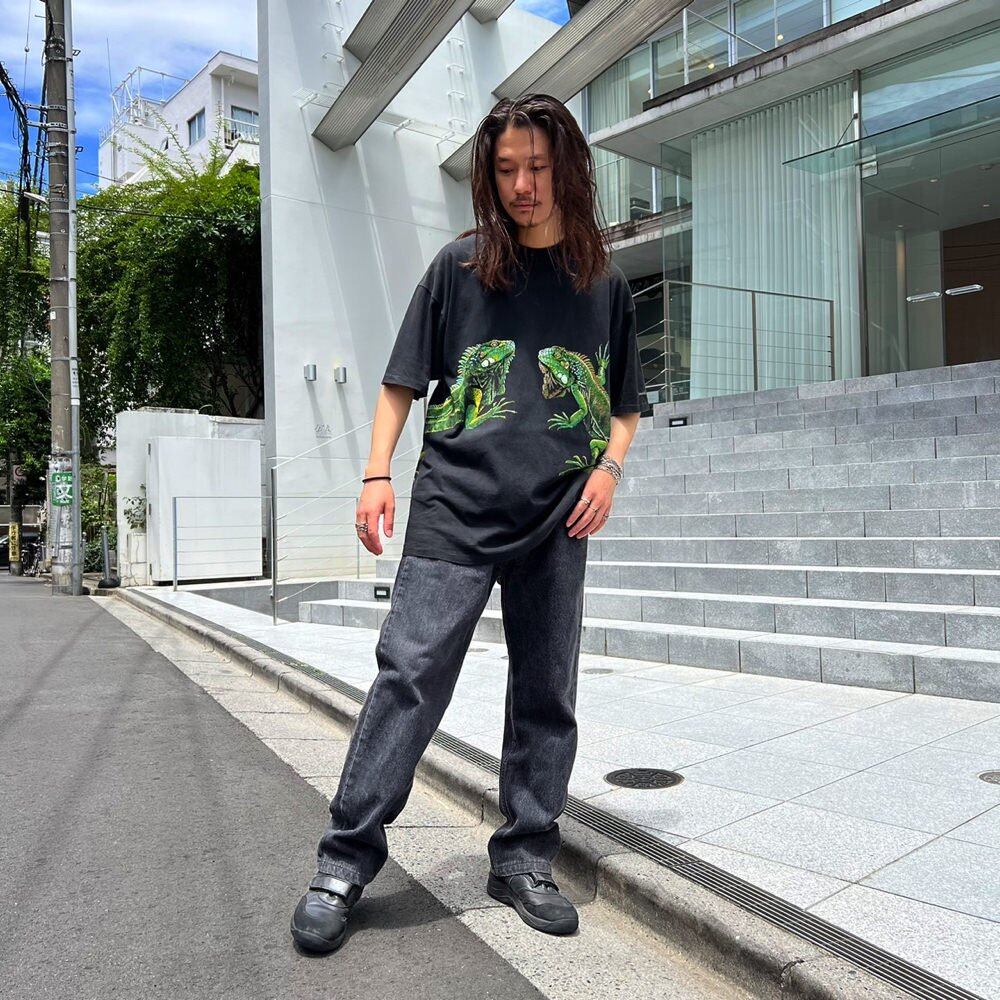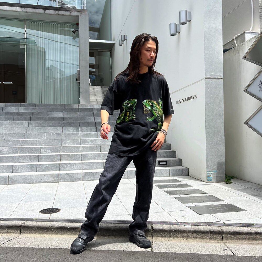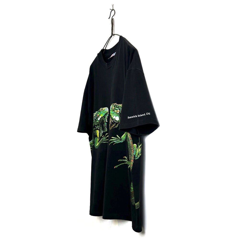 This is a 1991 souvenir T-shirt from Fenwick Island, a resort town in Delaware. It has a huge print of twin iguanas that hangs over the back, making it an impressive piece. This is a vintage reptile item that has been popular recently. The body is a Hanes XL size, and it has a nice, roomy silhouette.