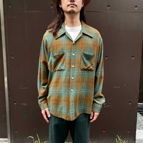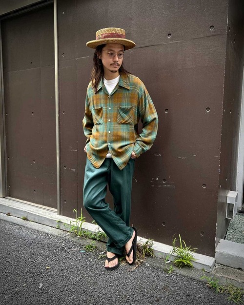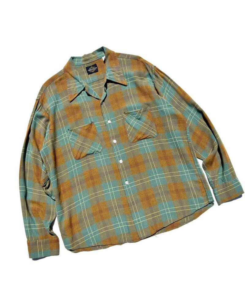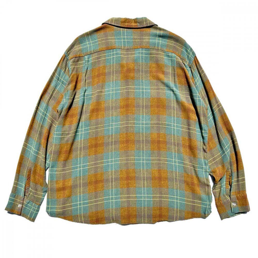 An open-collar shirt from the 1970s. The shadow check rayon fabric has become very rare in recent years, and the soft, slubby texture gives it a deep look. The contrasting colors give it an American retro vintage look. The rare XL size gives it a relaxed, draped silhouette. As this is an old item, it may have aged slightly. Please check the photos and be aware of the characteristics of vintage items before purchasing.