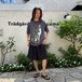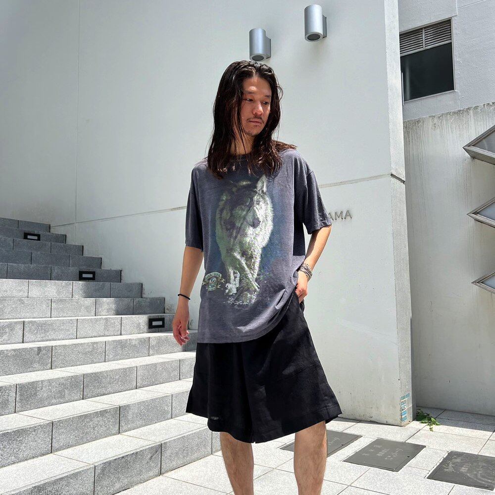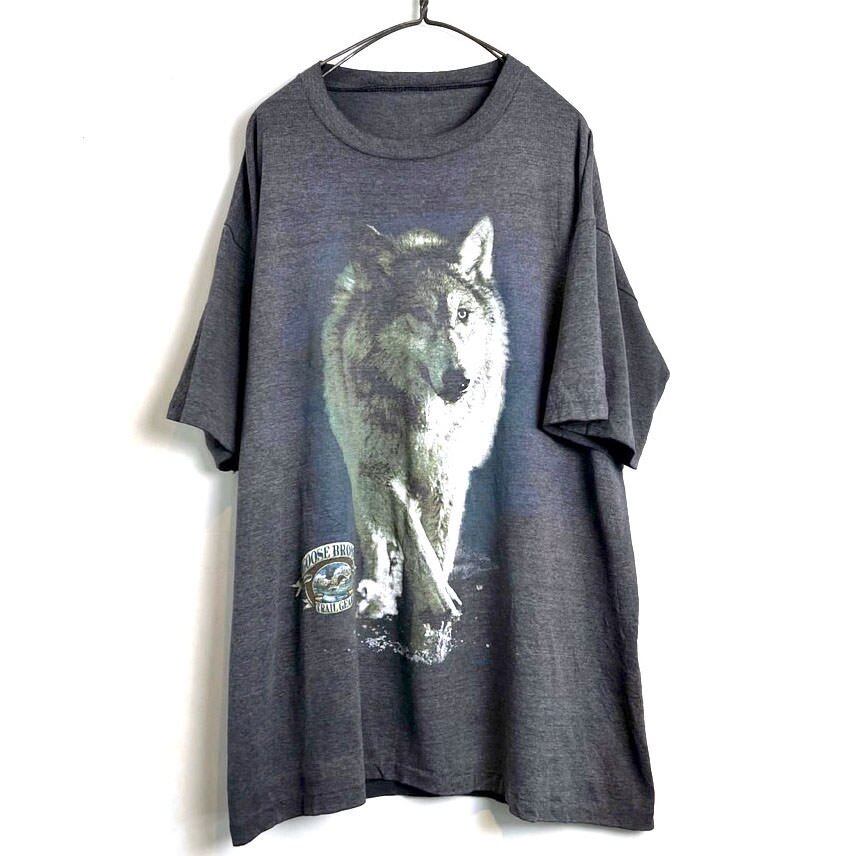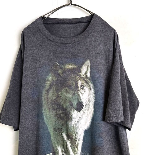 A 90s animal print T-shirt. The wolf print has a realistic presence, and the texture has cracked over the years, giving it a nice atmosphere. I cant confirm the size, but its about L to XL, and it has a nice, loose silhouette. The color is a marbled charcoal color.