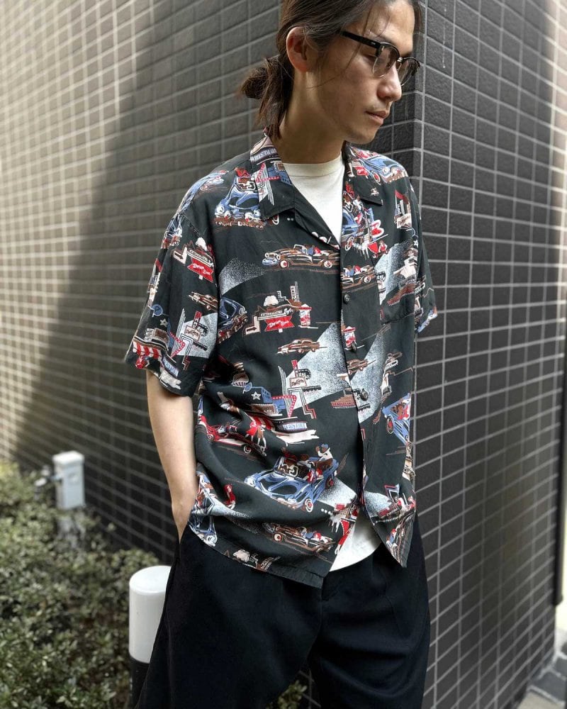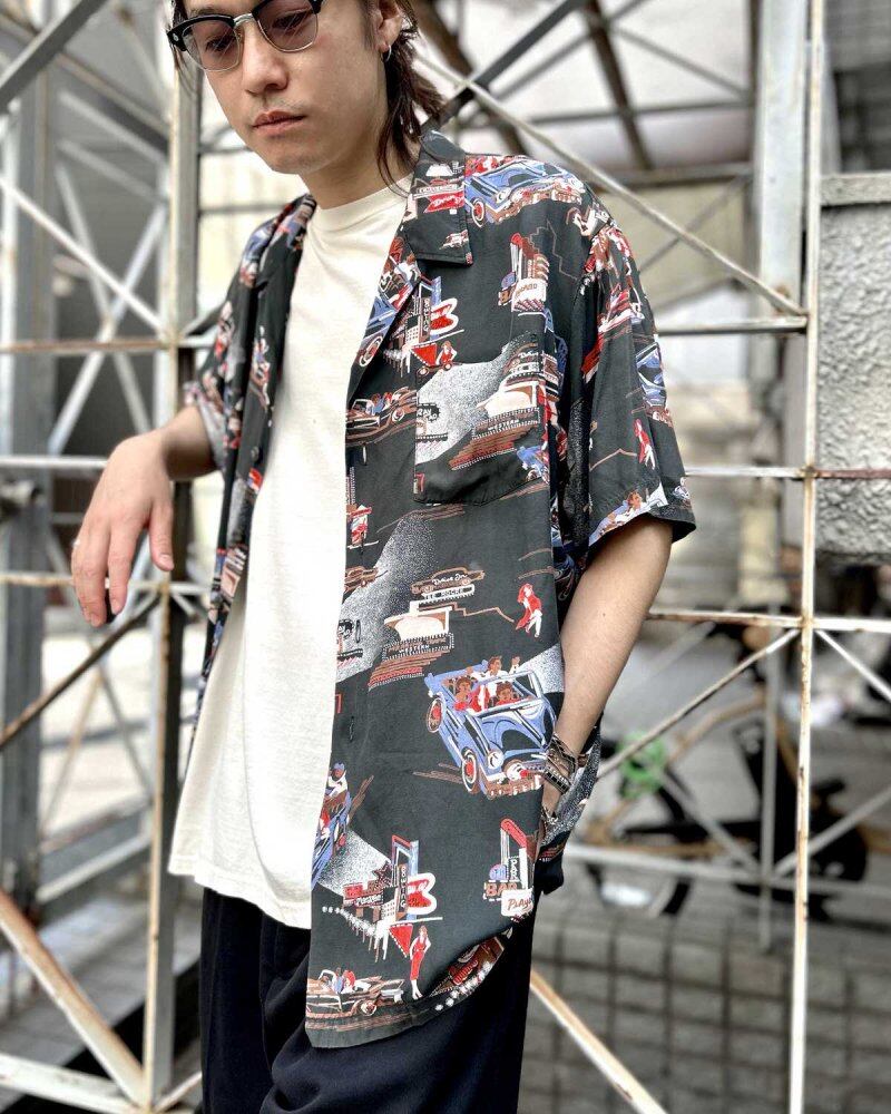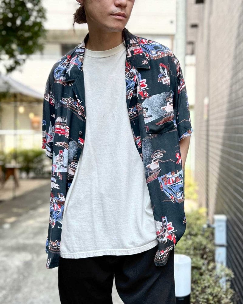Kennington started in a garage in California in 1957. It started with IVY fashion and is famous for items influenced by surf culture and counter culture. The faded black body features a scene of young people having a night out in a classic car, giving the design a cultural feel. The smooth rayon satin fabric has a light and comfortable texture. The silhouette is roomy yet neat, about XL size. Since it is an old item, it may deteriorate over time. Please check the photos and be aware of the characteristics of vintage items before purchasing.
