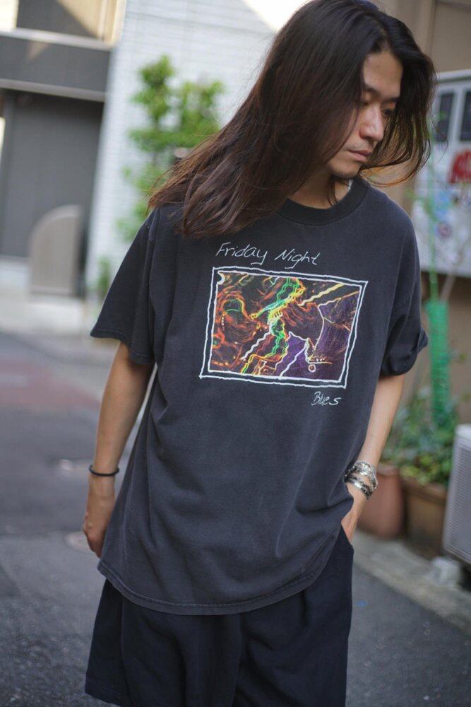 The faded neon color print of a hand playing a guitar creates a sensual nighttime atmosphere, and the faded black body with age gives this piece a presence that is unique to vintage items.