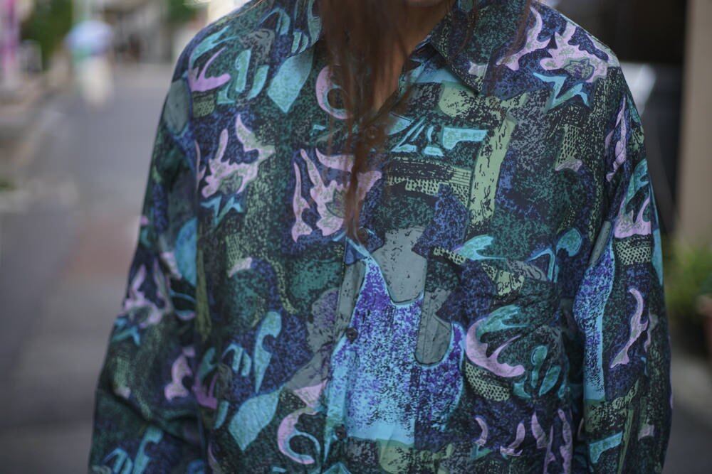 This is an art print silk shirt made by CCI around the 1990s.