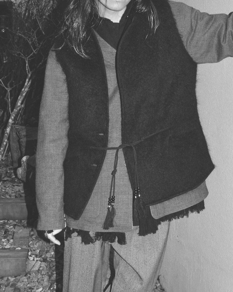 [ALVISTA] 6th issue Vol 2. 2024AW A vest inspired by the style of the Sami people, an ethnic minority group in the Lapland region (northern Norway, Sweden, Finland, and some parts of Russia). It is built based on the structure of the Australian Navy vest, incorporating the atmosphere of their handmade mouton vests. It is reversible with a completely different look, with a minimalist design that makes use of the rich long hair shaggy texture with hooks and cords on the surface, and a design reminiscent of a deck vest using high-density back satin with uneven yarn on the back. It is finished with a size balance that can be worn as an outer layer over a light outer layer or as an inner layer while avoiding extreme oversize. The cord is linen cord, and the buttons are genuine nut buttons. The tip of the cord is made of sterling silver and antique beads (black is genuine buffalo, sand is camel bone)