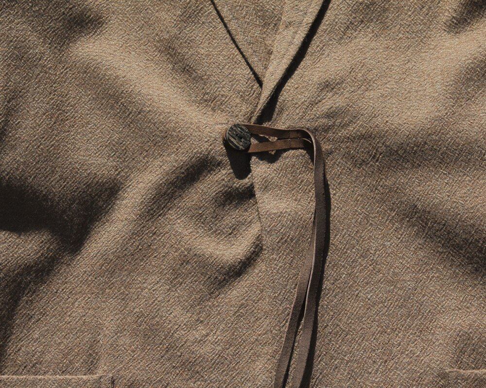 [ALVISTA] 6th issue Vol 2. 2024AW A cardigan jacket inspired by the stole style worn by women of the Sami people, an ethnic minority group in the Lapland region (northern Norway, Sweden, Finland, and some parts of Russia). The style of wearing it by wrapping it around the body has been replaced with a modern style and reconstructed as a wearable stole. The fringe processing on the hem and cuffs, which are remnants of the stole, is the highlight, and although it is a simple cardigan-type jacket, it looks great just by putting it on. The buttons are machined and made of buffalo buttons that give each piece a different feel, and the cord is made of genuine leather suede cord.
