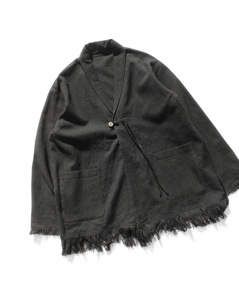 [ALVISTA] 6th issue Vol 2. 2024AW A cardigan jacket inspired by the stole style worn by women of the Sami people, an ethnic minority group in the Lapland region (northern Norway, Sweden, Finland, and some parts of Russia). The style of wearing it by wrapping it around the body has been replaced with a modern style and reconstructed as a wearable stole. The fringe processing on the hem and cuffs, which are remnants of the stole, is the highlight, and although it is a simple cardigan-type jacket, it looks great just by putting it on. The buttons are machined and made of buffalo buttons that give each piece a different feel, and the cord is made of genuine leather suede cord.