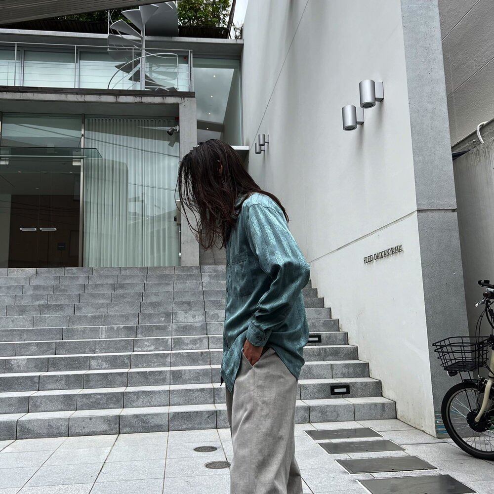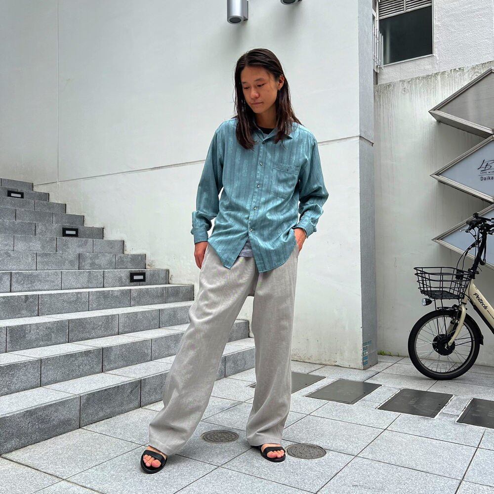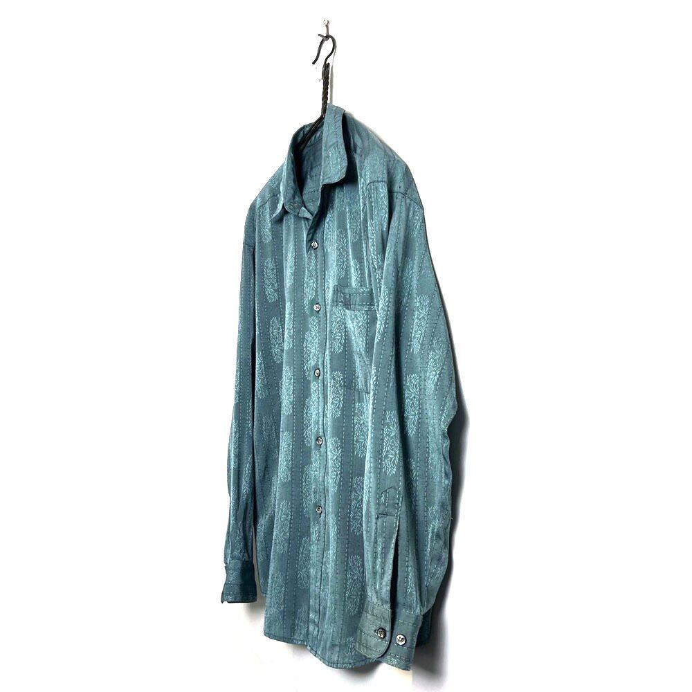 A long-sleeved shirt from the 80s. It has a calm and refreshing sax blue color, and the fabric has a nice texture with a woven botanical pattern stripe. It is made of thin, light, and smooth 100% cotton fabric. It has a good silhouette with a moderately loose fit.