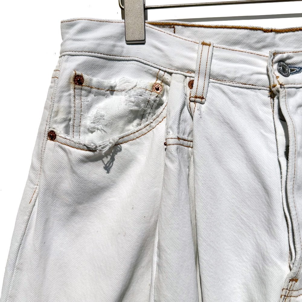 The blue denim is white bleached to create an uneven texture and a tasteful white color.
