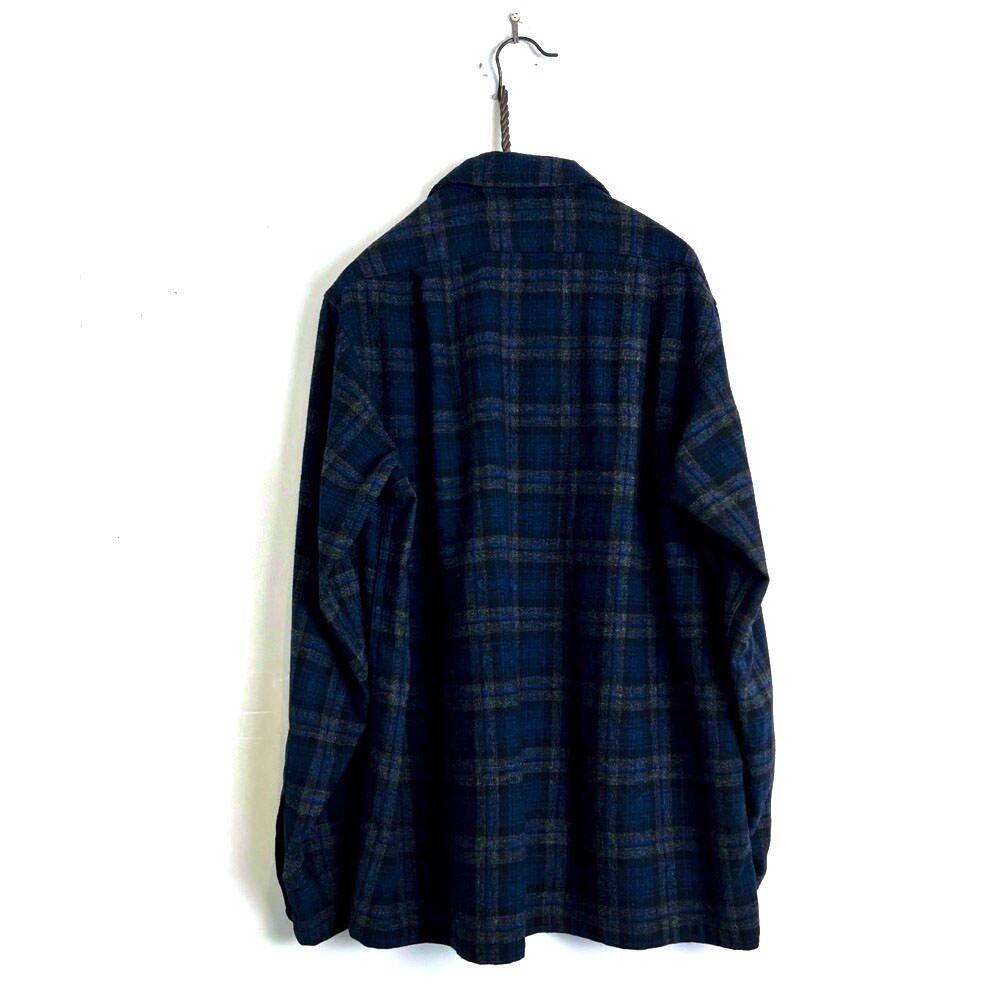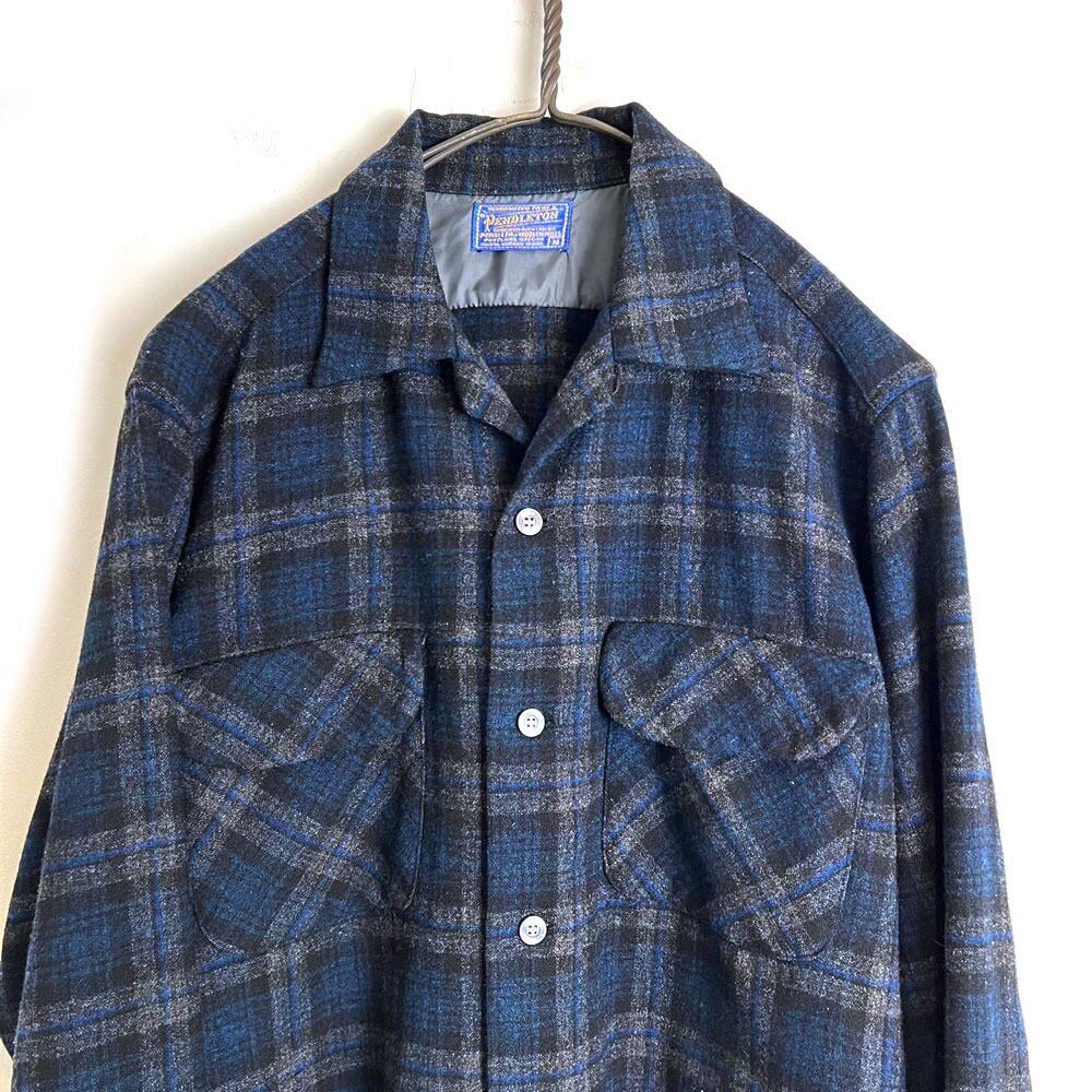 A 1962 Pendleton wool shirt with a nice dark-toned check pattern in blue, black, and gray. Made from high-quality 100% wool fabric, typical of vintage Pendleton. Size listed is M, but it fits just right with a comfortable fit.
