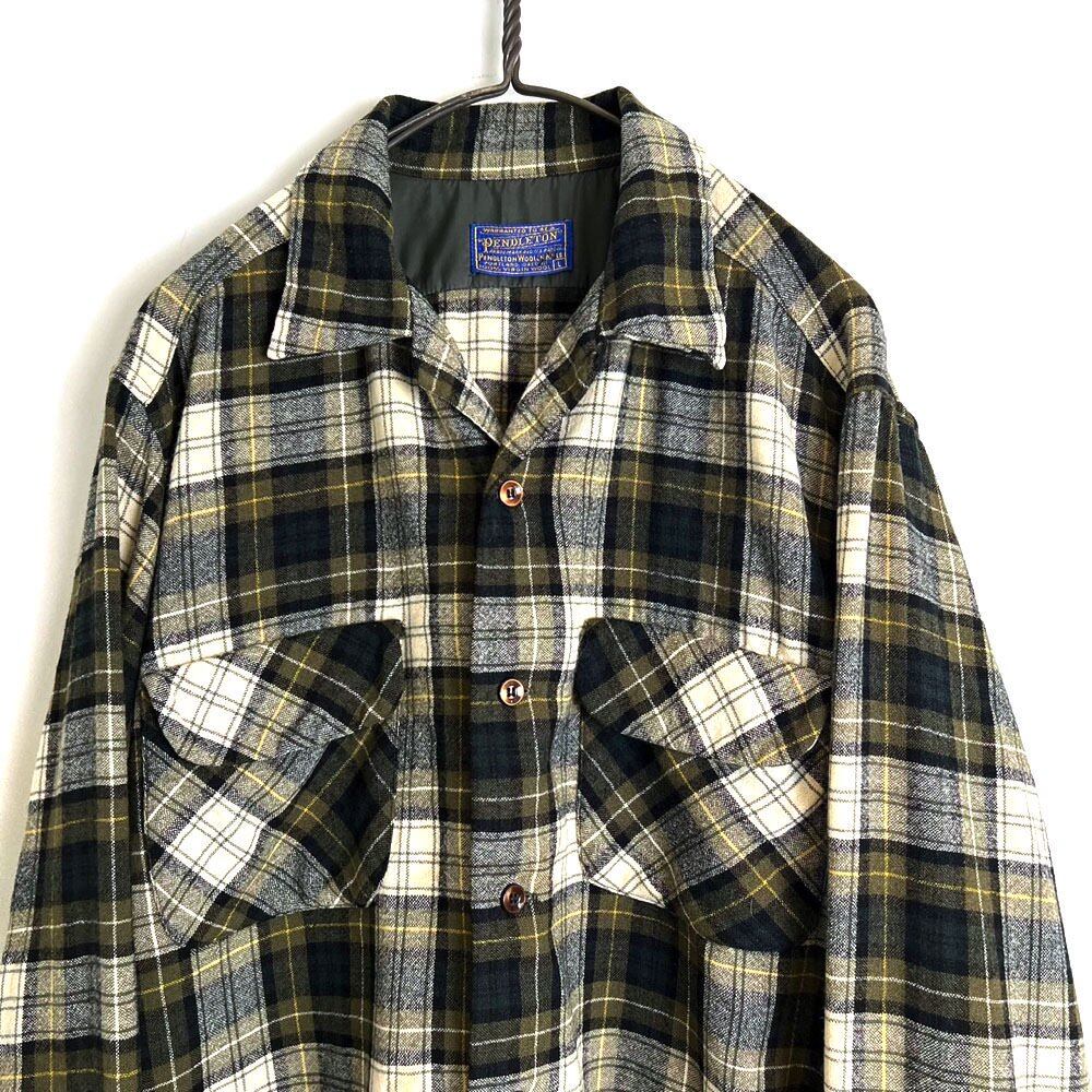 A 1960 Pendleton wool shirt with a tasteful olive, white, and black check pattern. Made from high-quality 100% wool fabric, unique to vintage Pendleton. Size L, with a relaxed silhouette.