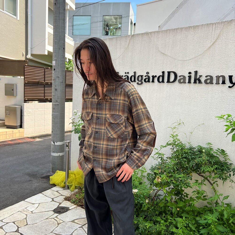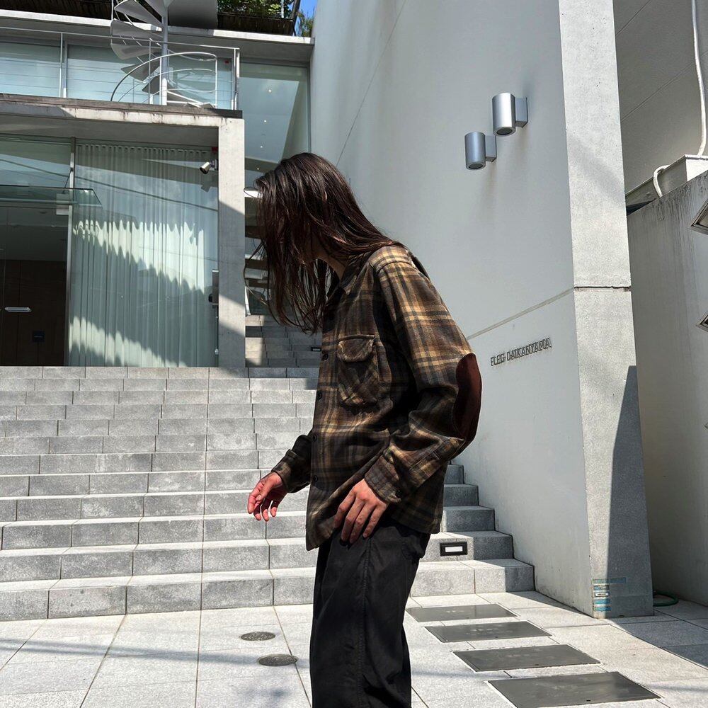 A 70s Pendleton wool shirt. A check pattern in earthy brown, beige and grey tones with genuine suede elbow patches for a masculine look. There are a few holes and damage, but the grunge feel is also a tasteful piece. The size is L, and the fit is just right for a well-balanced silhouette.