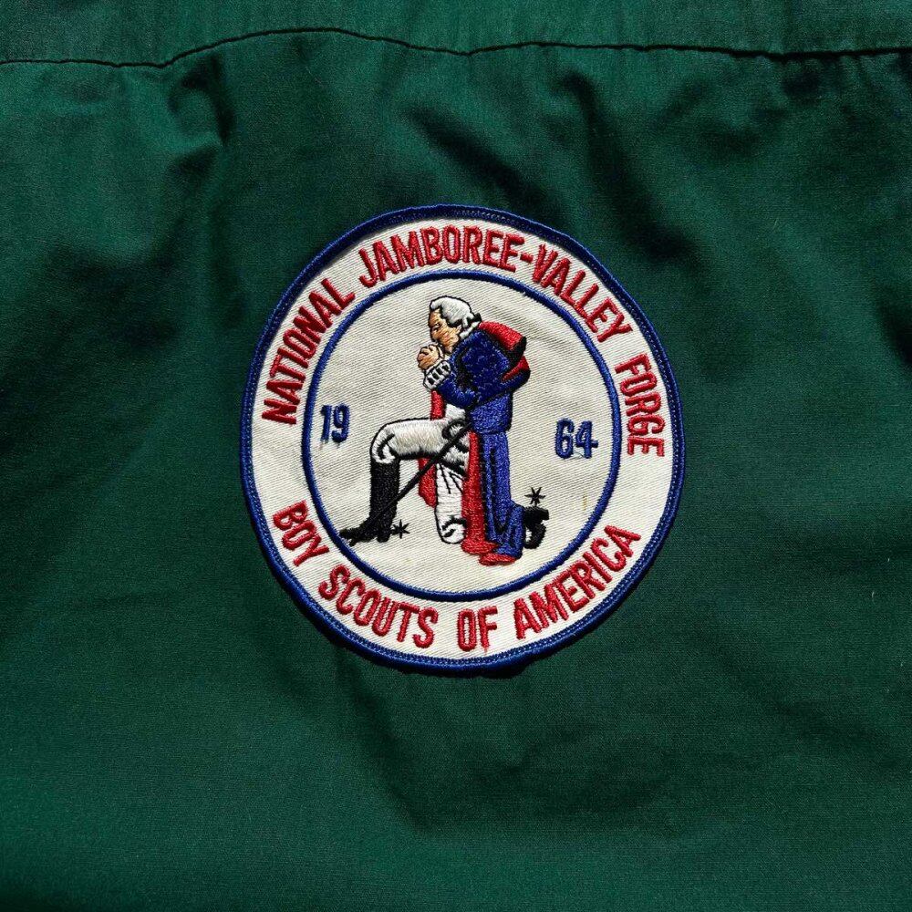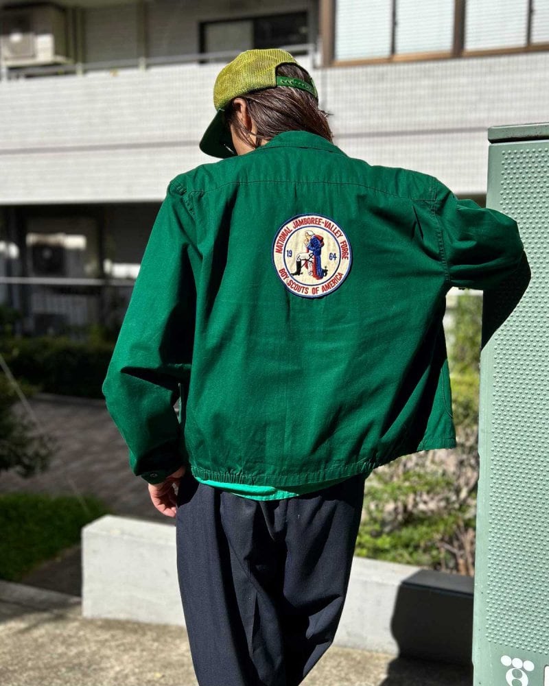 This is an official Boy Scout drizzler jacket from the 1960s. The shape is very similar to the McGregor patented drizzler jacket, and it features a distinctive D-pocket and light cotton satin fabric, making it a utility item for any season. The deep forest green gives it a vintage look. The condition and size are good, and the simple design with little customization is also attractive. Since it is an old item, there may be rare deterioration over time. Please check the photos and be aware of the characteristics of vintage items before purchasing.