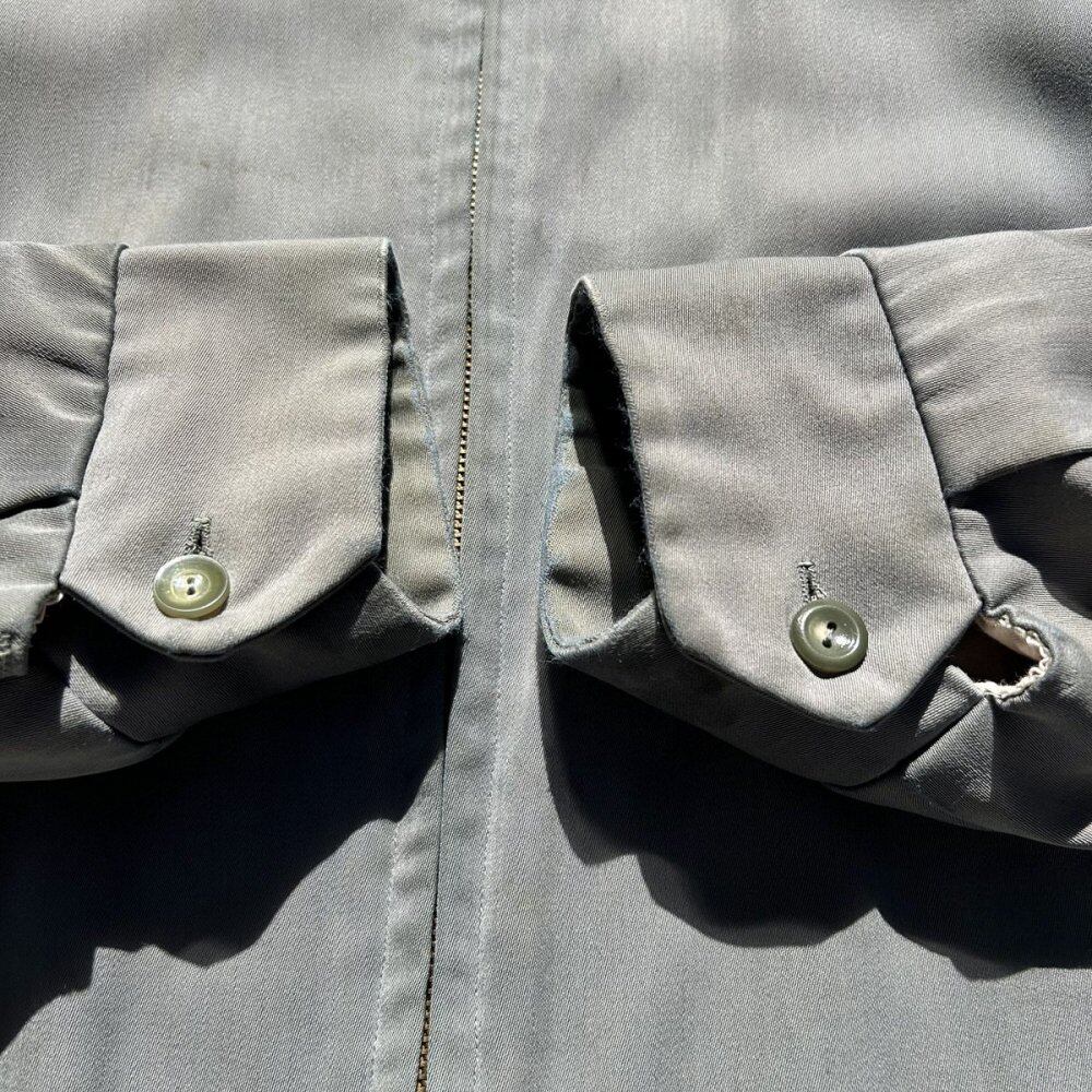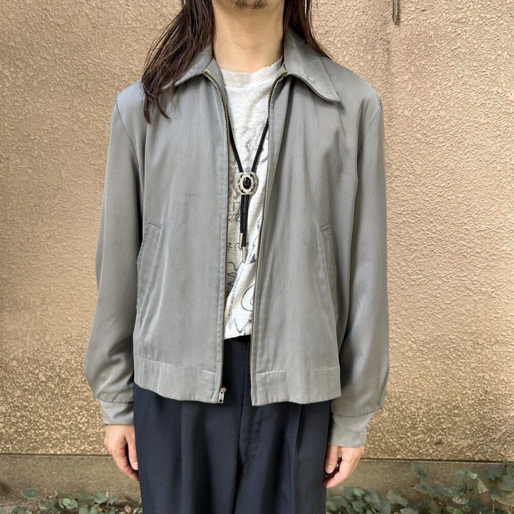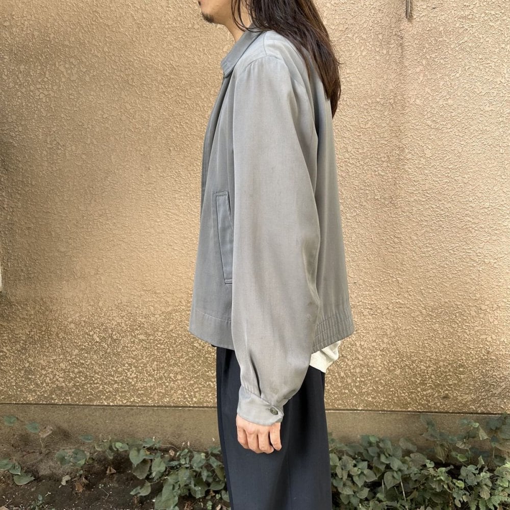 A gabardine jacket from the 1950s. This item was made of rayon gabardine fabric and was seen from the 1940s to 1960s. It is also called the Ricky jacket because of the jacket worn by the character Ricky Ricardo in the TV drama I Love Lucy, which aired in the United States in the 1950s. This jacket has a classic gray fabric that gives it a mannish and elegant look. It is a size 38, but it has a well-balanced silhouette, the lining has been nicely repaired, and the outer fabric is in good condition for this item, so it looks like it can still be worn for a long time. Since it is an old item, it may deteriorate over time. Please check the photos and be aware of the characteristics of vintage items before purchasing.