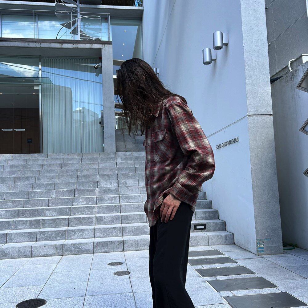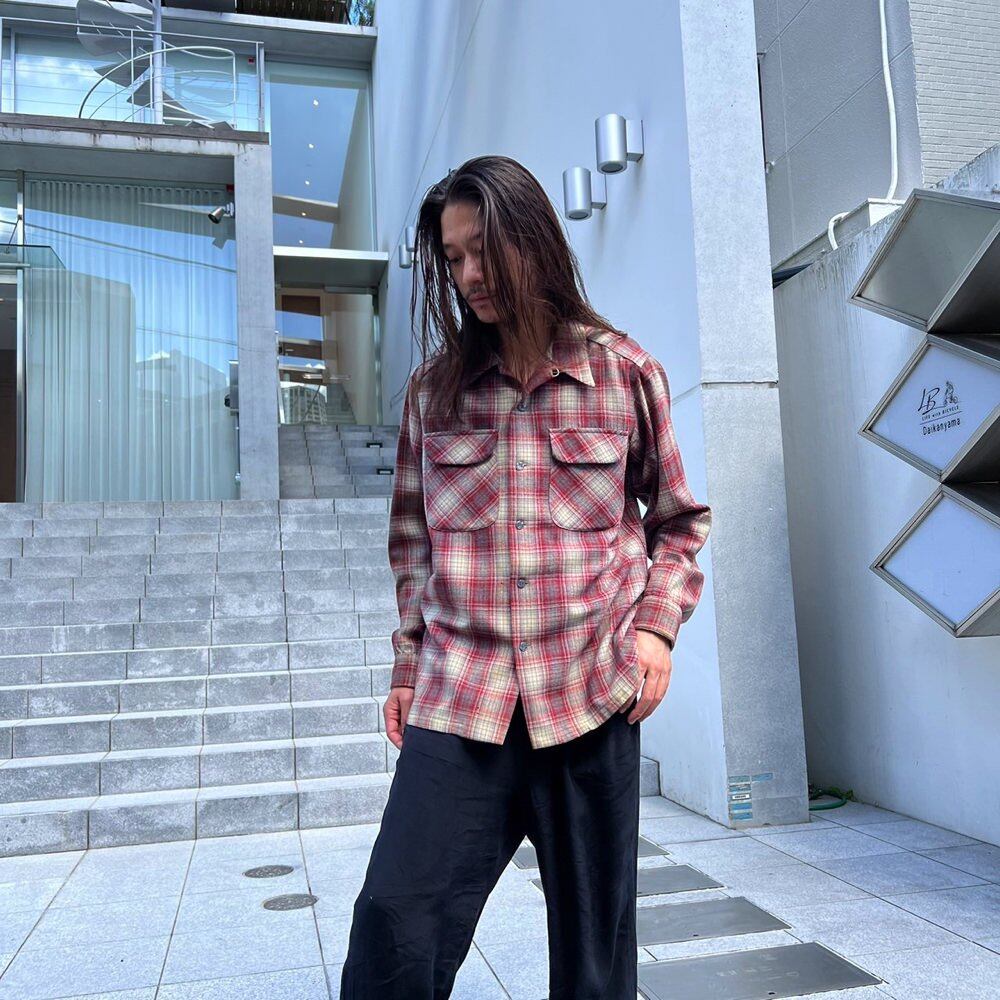 This is a 70s Pendleton wool shirt with a nice red x off-white x grey ombre check pattern. The size is M, but it is a well-balanced silhouette with a moderate amount of room without shrinkage.