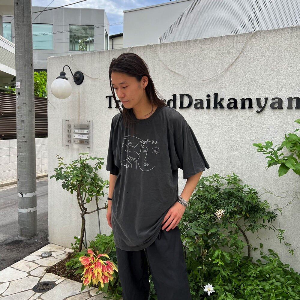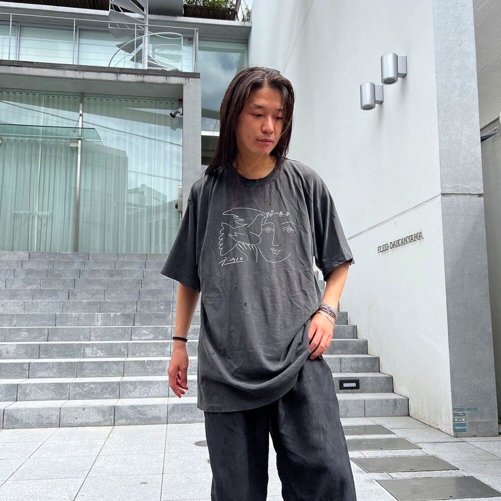 An art T-shirt from the 90s with Picassos Dove of Peace printed on it. A tasteful design with simple white lines on a faded black body. A relaxed, oversized silhouette. There are holes and damage in several places, but it is still fine for wearing.