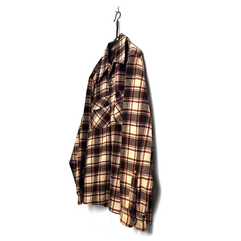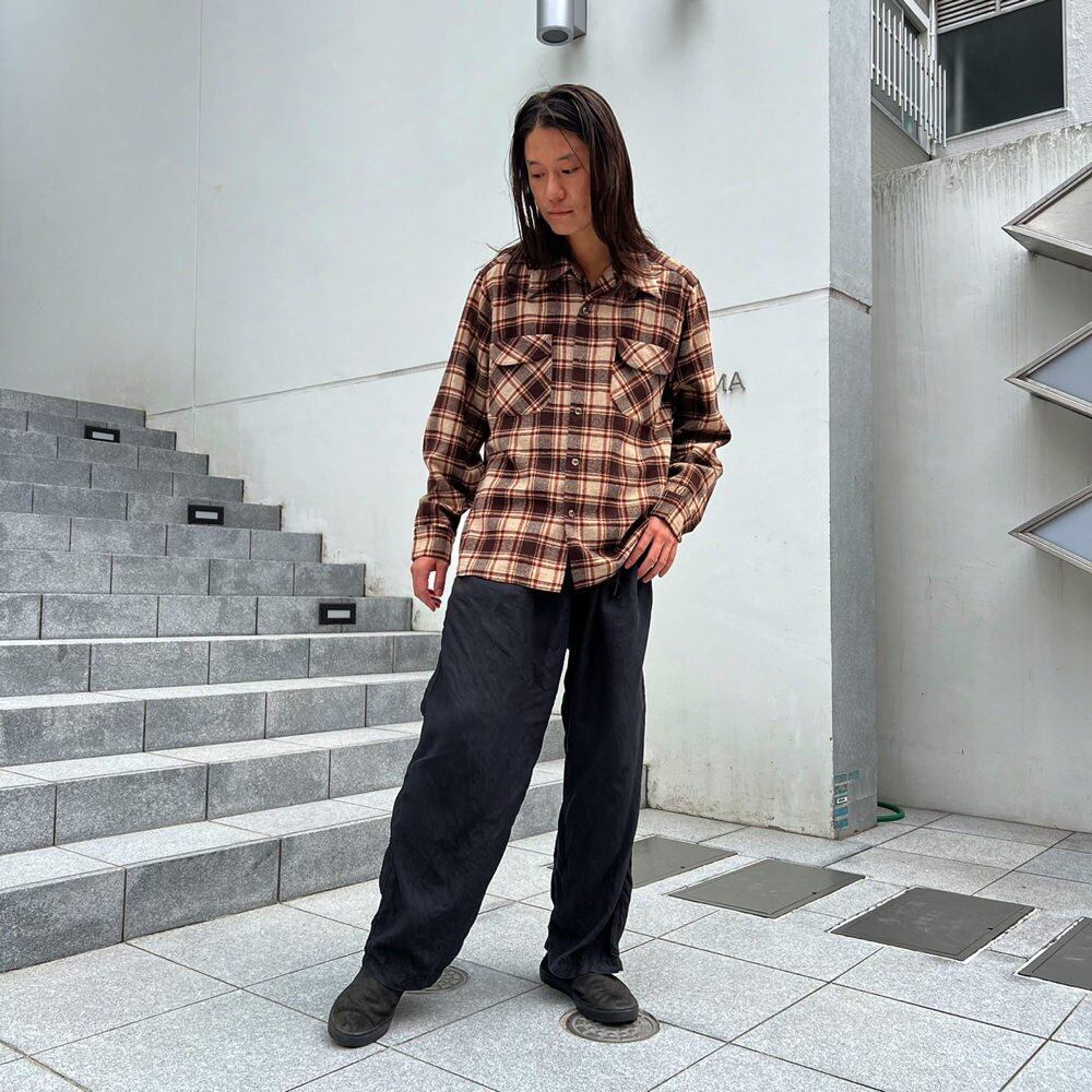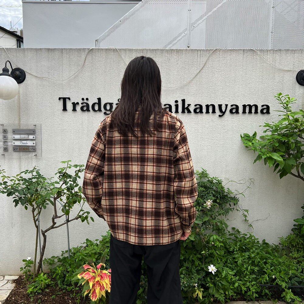 This is a 70s Pendleton wool shirt with a nice beige x brown check pattern that gives off an earthy vibe. The size is M, but it is a well-balanced silhouette with a comfortable fit that doesnt shrink.