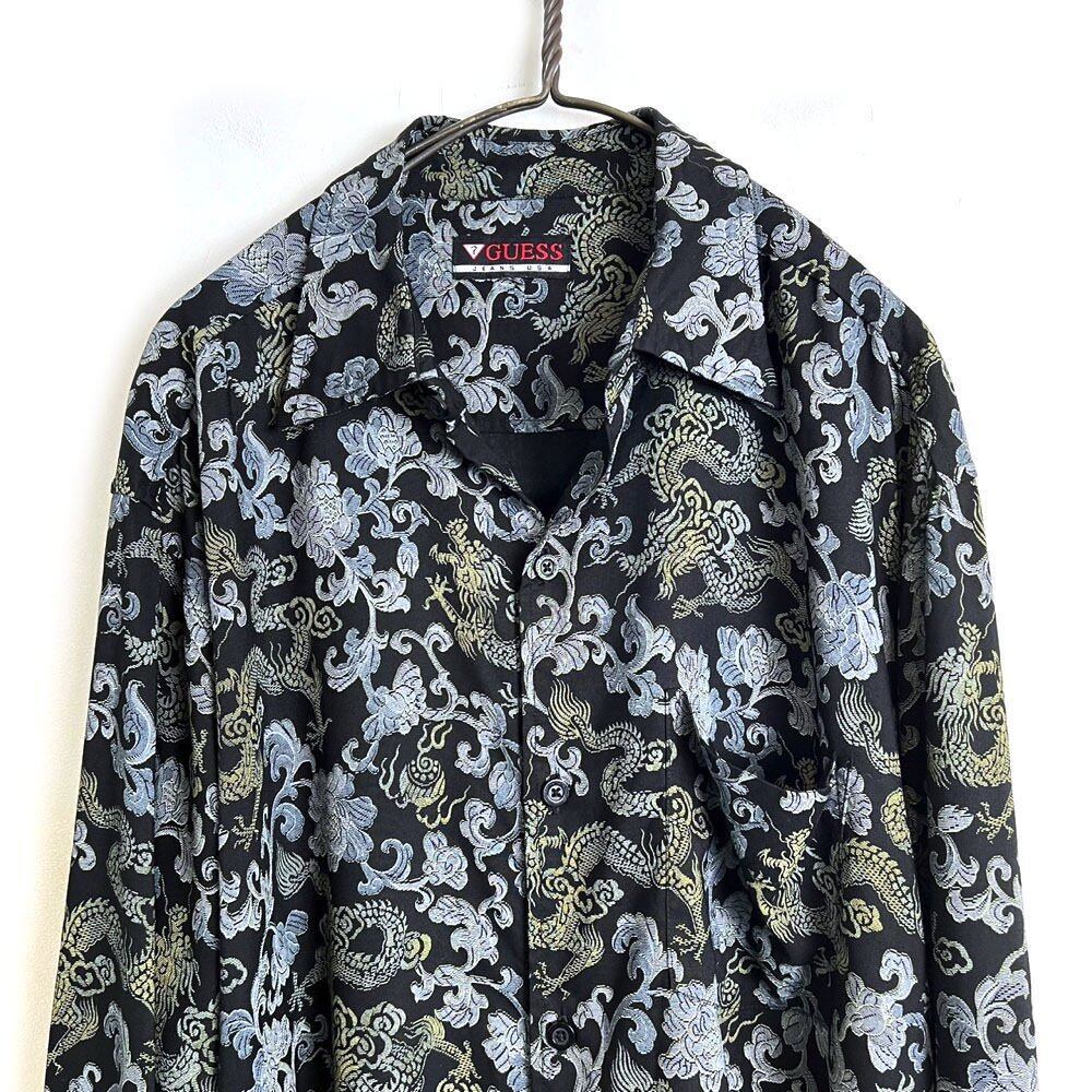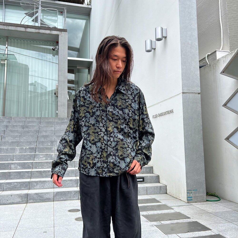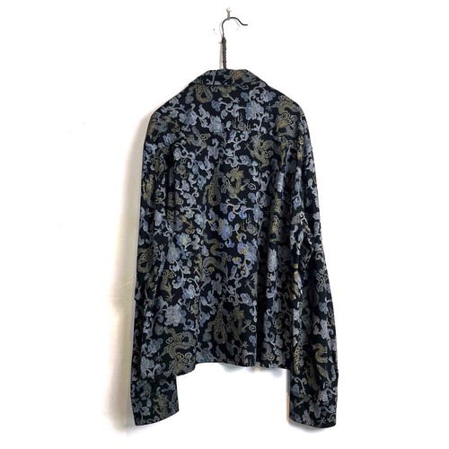 A 90s rayon shirt with a nice dragon and botanical print that looks like a woven pattern. A moderately loose fit and a slightly short length for a modern silhouette.