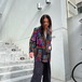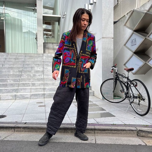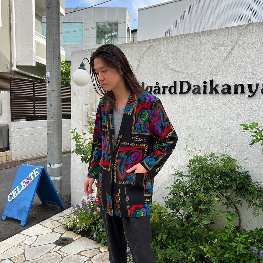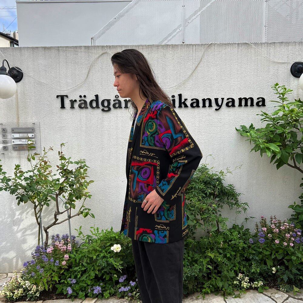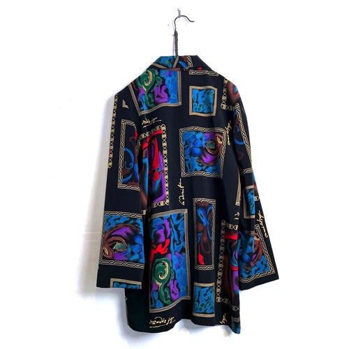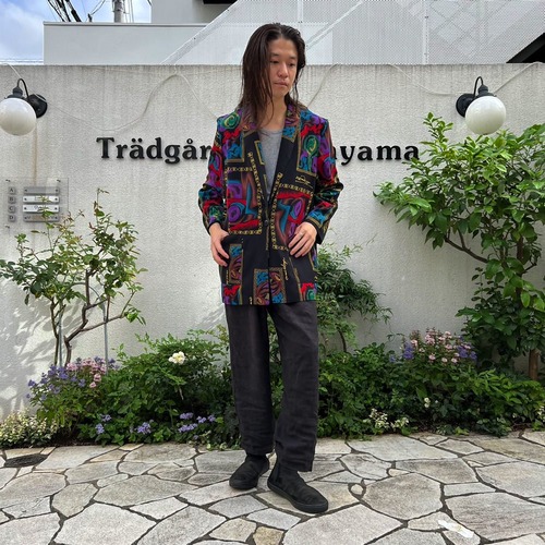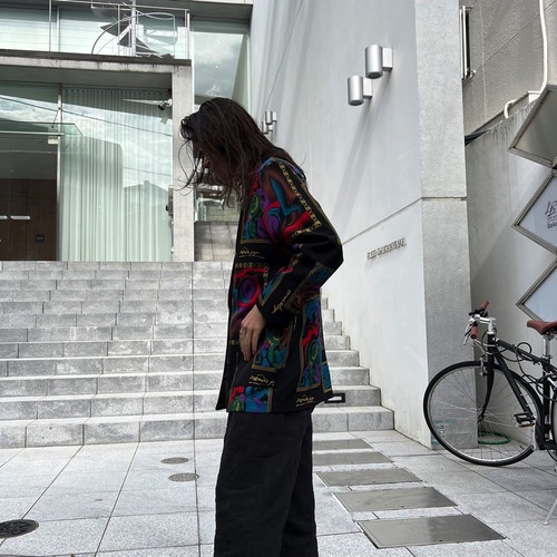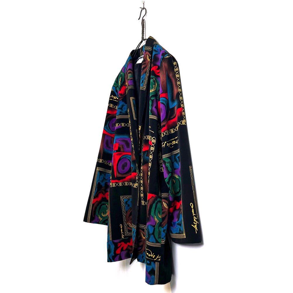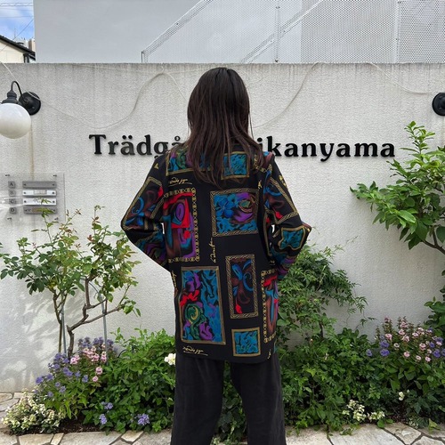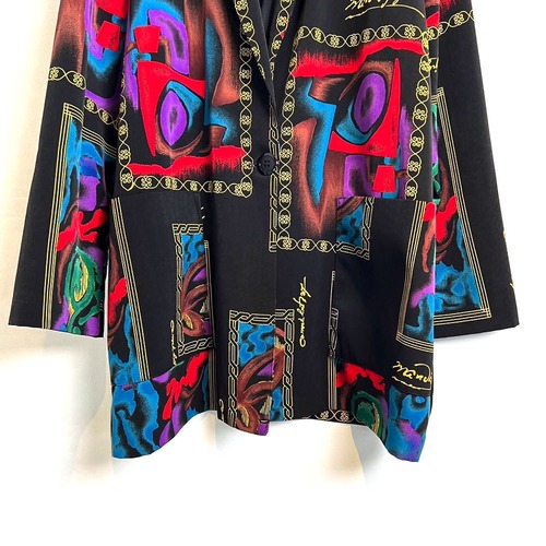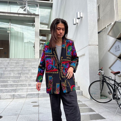 A light jacket from the 80s. A piece with a black base color and vivid abstract art printed on it. Made of 100% polyester fabric with a smooth texture and light feel. A soft, casual style jacket that is not too stiff.