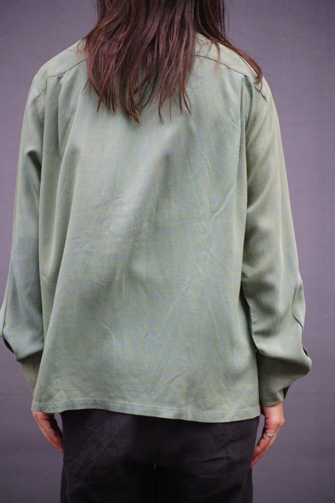 The fabric used is rayon gabardine, which has just the right weight and a smooth, silky texture, giving it a high-quality feel with soft drape, and yellow threads are woven into the weft, giving it a deep, vintage, chambray-like color.