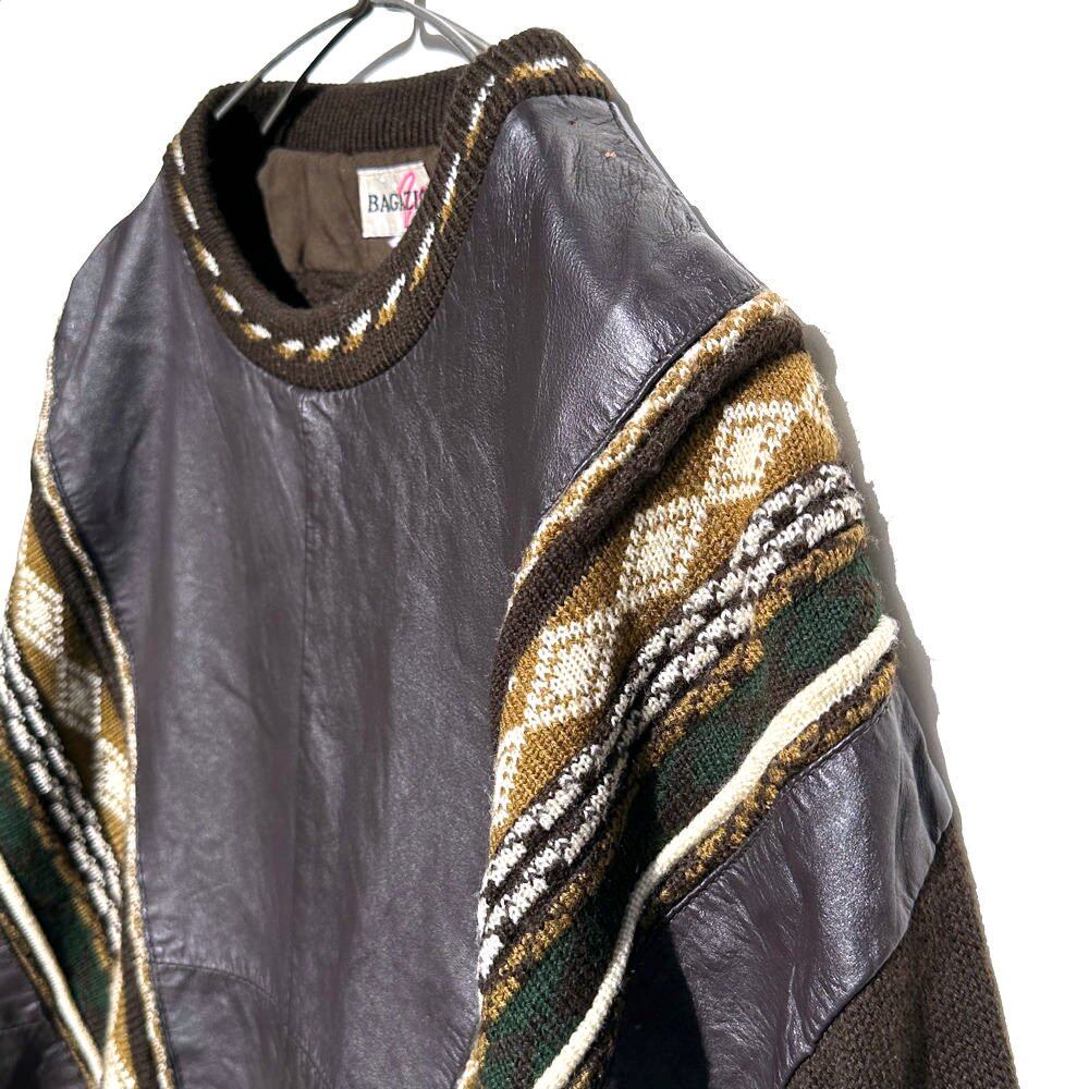 This is a leather and acrylic wool crew neck knit made by BAGAZIO around the 1980s.