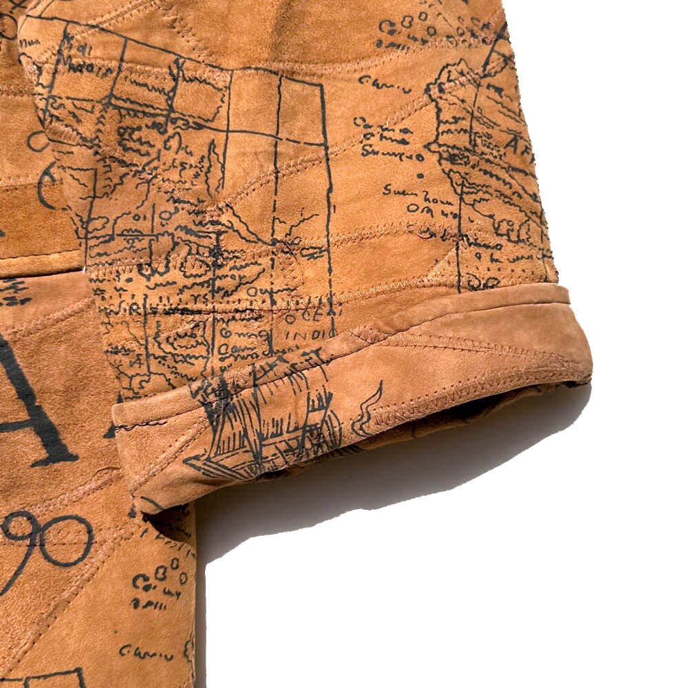 The bag is made from nubuck leather with a unique matte texture, and features an impactful artwork with a retro world map from the 1990s printed on the patchwork body.