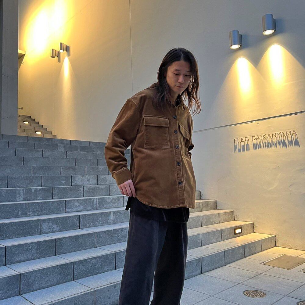 This jacket has a boxy silhouette with a wide body like a CPO jacket. There are seam pockets on both sides, making it a versatile piece. The camel brown color has an earthy feel.