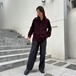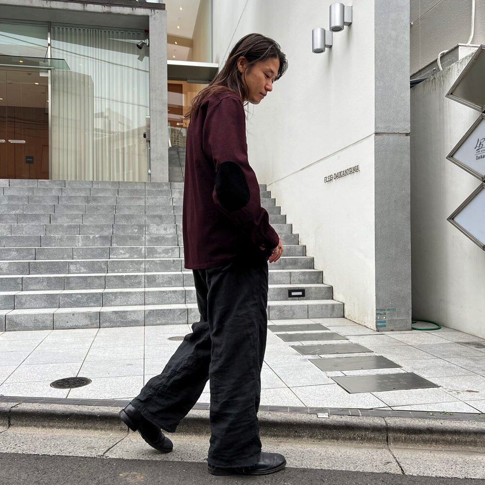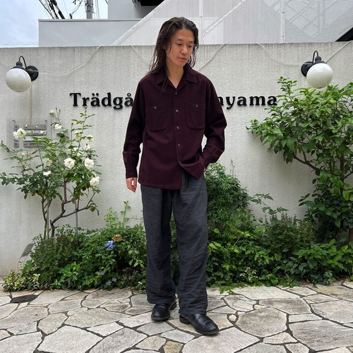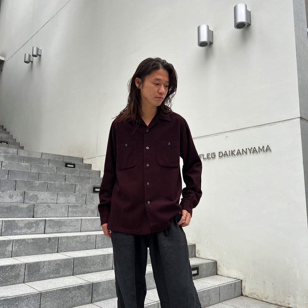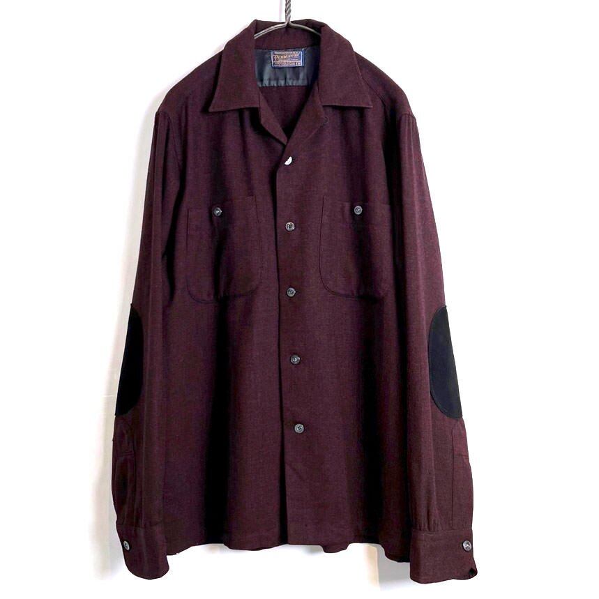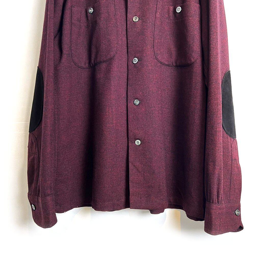 A 60s Pendleton wool shirt in a deep Bordeaux-like color with a red and black marbled fabric. The size is M, but it has a loose fit without shrinking, giving it a great silhouette. The design has suede patches on the elbows.