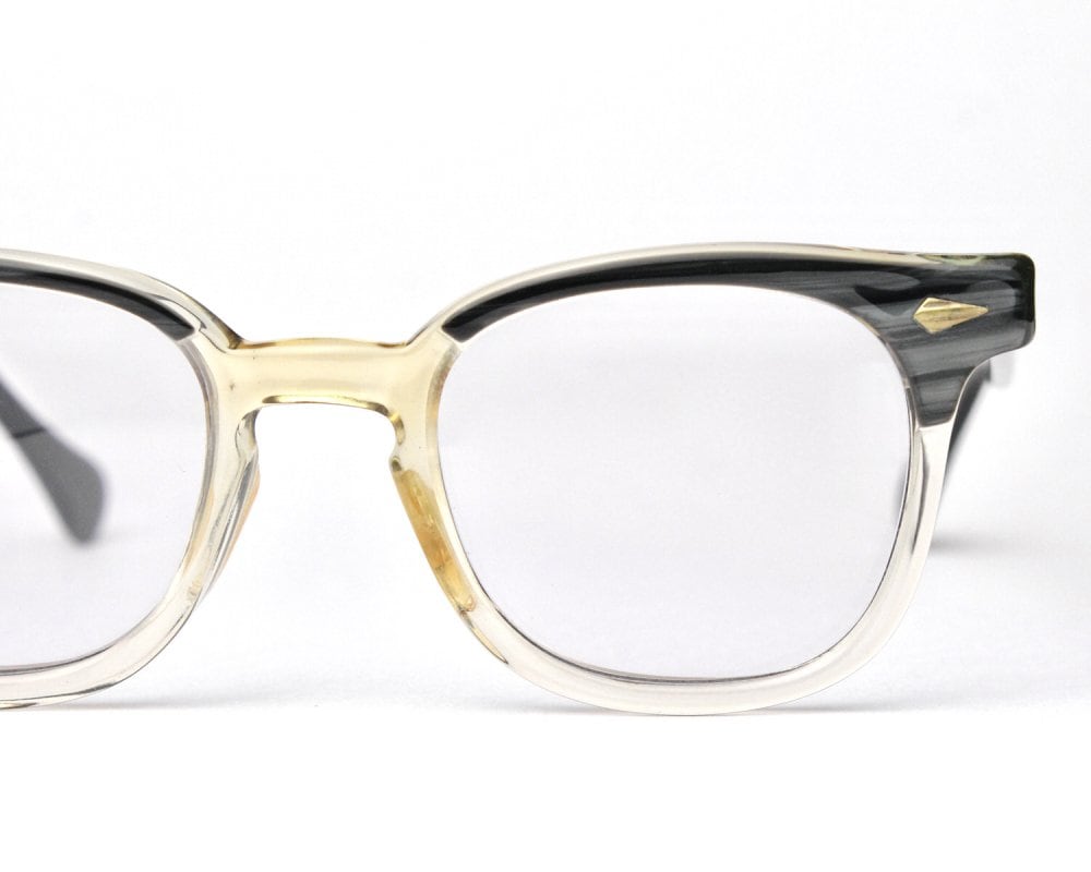 LIBERTY OPTICAL is a long-established manufacturer founded in New Jersey in 1929 and continues to this day. This frame is from around the 1950s. The horn-rimmed Wellington style and wood-like black-gray x yellow-clear two-tone color give it a mannish look that is more typical of this era. New UV lenses in a light grayish purple color have been installed. The glasses have been maintained at an eyeglass store and polished to give them a natural luster. We have carefully examined the condition, but as they are vintage products, there may be some scratches and scuffs. Please understand the characteristics of vintage and antique items before purchasing. All of our glasses are maintained and lens replaced at g room, an eyeglass store in Ebisu, Tokyo.