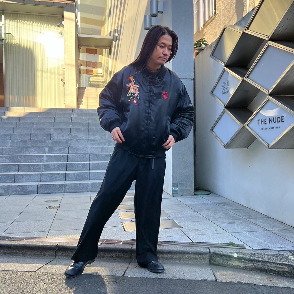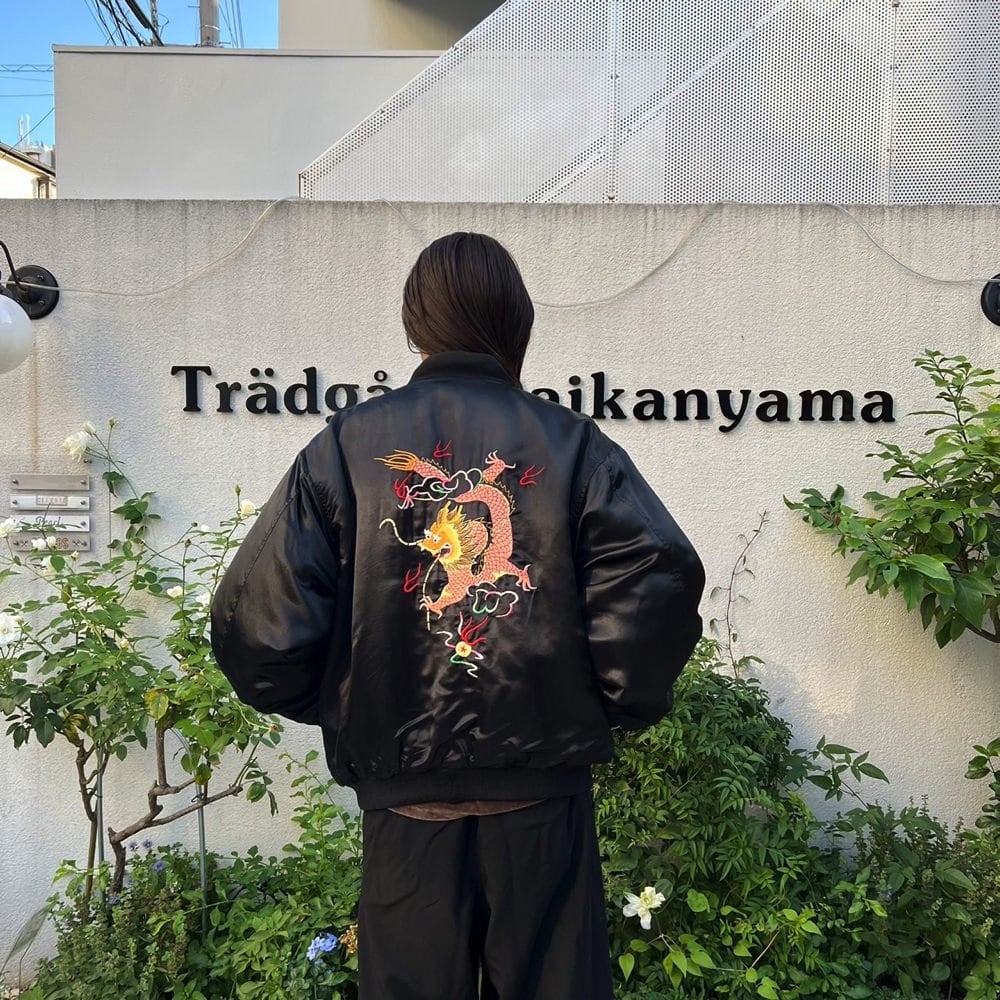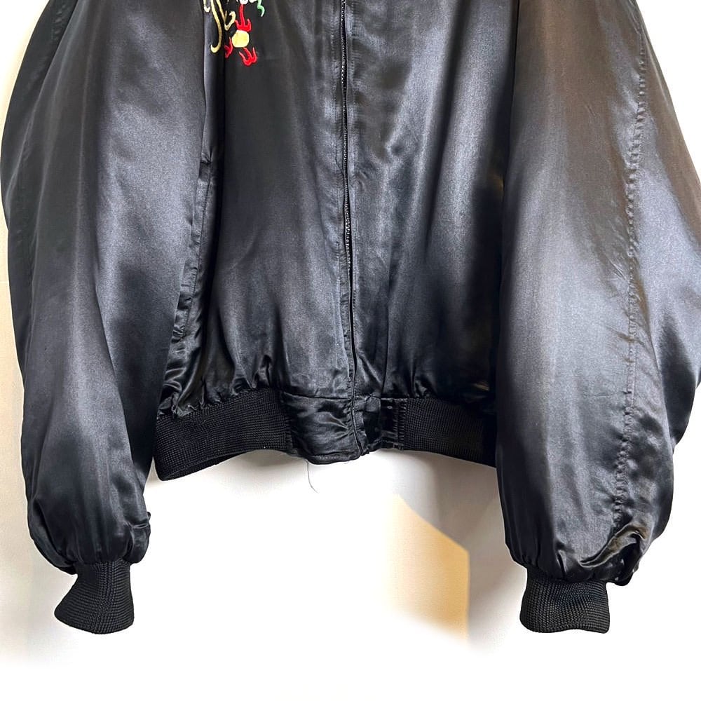 This souvenir jacket from the 80s has a nice dragon embroidery on the front and back. Its hard to find a souvenir jacket with a loose fit, but this one fits perfectly. Its made of a smooth satin fabric thats a blend of rayon and silk, and is well padded for extra warmth.