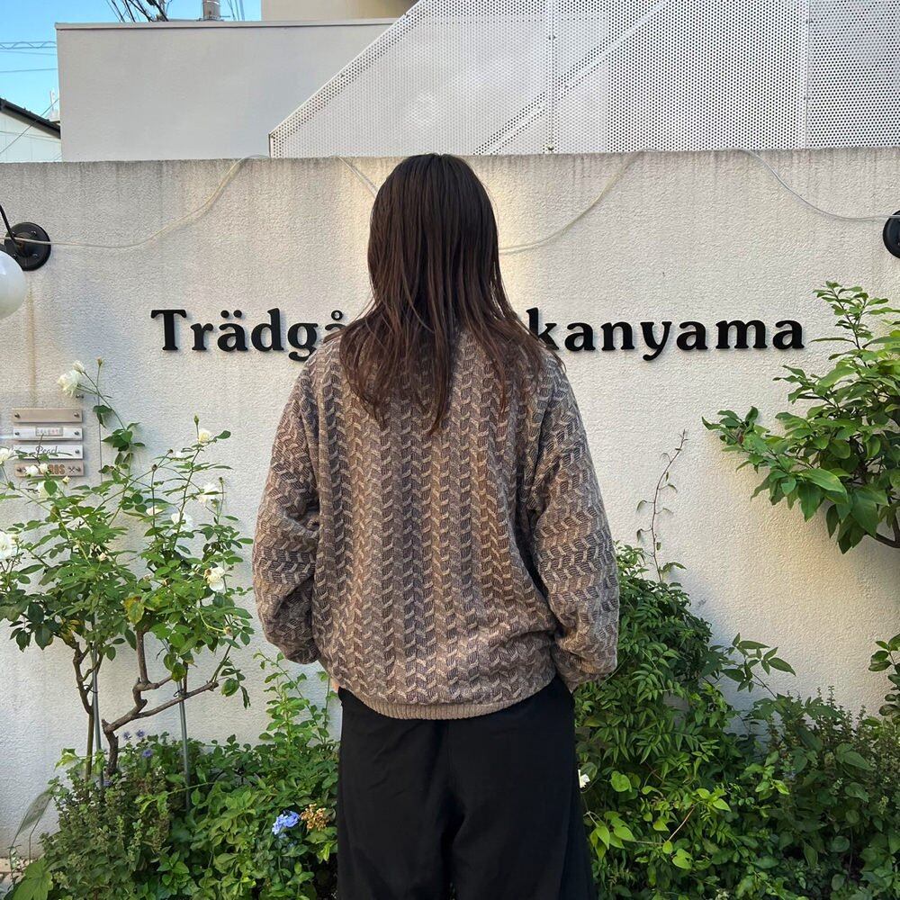 A crew neck sweater made in Bulgaria in the 90s. A calm and pleasant color scheme of grayish beige mixed with subtle navy and brown. A cotton x acrylic blend knit with a smooth texture that is not itchy. A very roomy fit and a great silhouette.