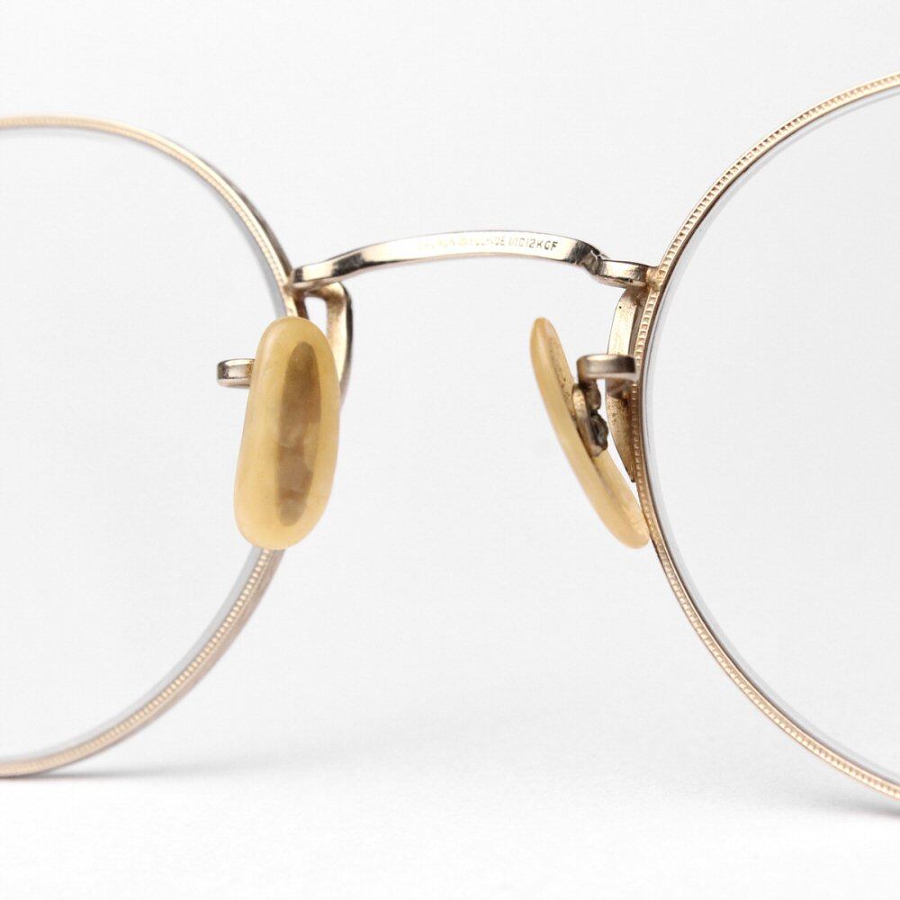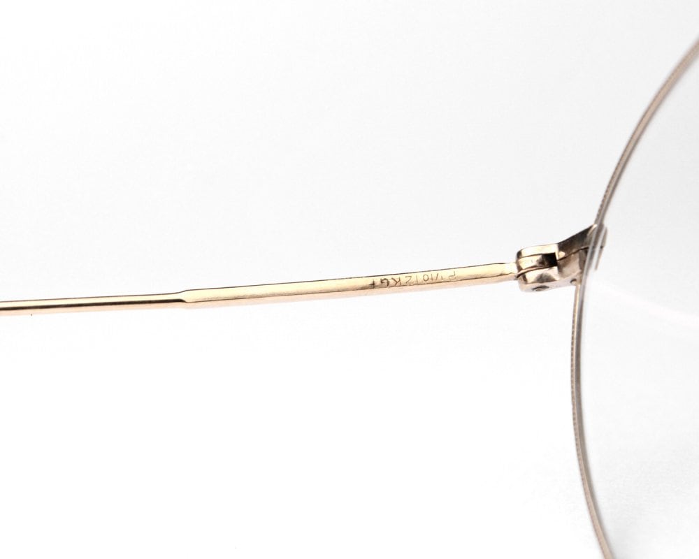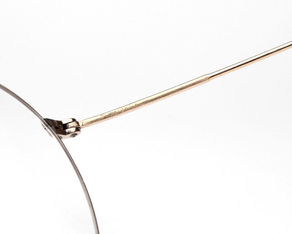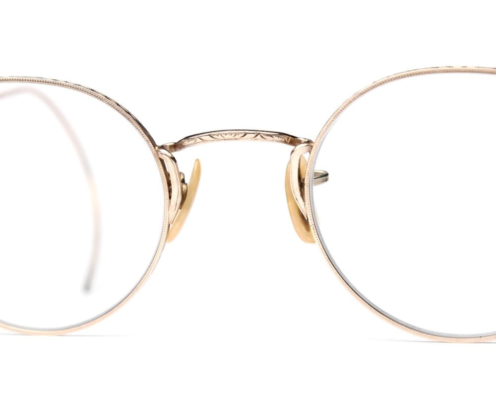 These are vintage [Schron] glasses from the late 1930s. The full-view Boston round frame with temples at the top, developed in the era of cars, is a very rare 45 (almost 46) size, giving it a more modern look and feel. The silhouette is unique to Schron, with the top part looking like a panto style. Gold-plated with 12Kt-Yellow Gold. New clear UV lenses have been inserted. Appraisal and maintenance have been completed at an eyeglass store. The temples (or rope handles) can be adjusted to the desired bend (at your local eyeglass store). Although the condition has been carefully examined, as this is a vintage product, there may be some scratches or scuffs. Please understand the characteristics of vintage and antique items before purchasing. All of our glasses are maintained and lens replaced at g room, an eyeglass store in Ebisu, Tokyo.