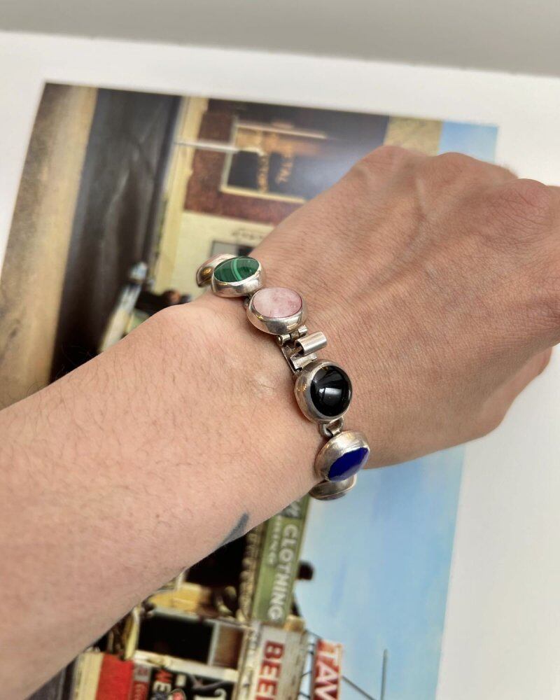 Made in Mexico, one of the worlds leading silver mining areas, where many silver artists and craftsmen have gathered since ancient times. This vintage piece has evolved in its own way, with influences ranging from Aztec natives to Native American jewelry with influences from the American Southwest, and sophisticated Scandinavian minimalist designs. It is a beaded bracelet-like design with various gemstones inlaid into a sterling body, giving it a pop and silver look that is both elegant and subtle. The silhouette is heavy yet not too assertive. The engraving has worn off, but the design and texture of the piece make it sterling silver made in Mexico. Since it is an old item, there are scratches, etc. Please check the photos and understand the characteristics of vintage items before purchasing.