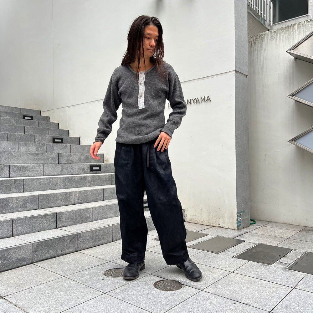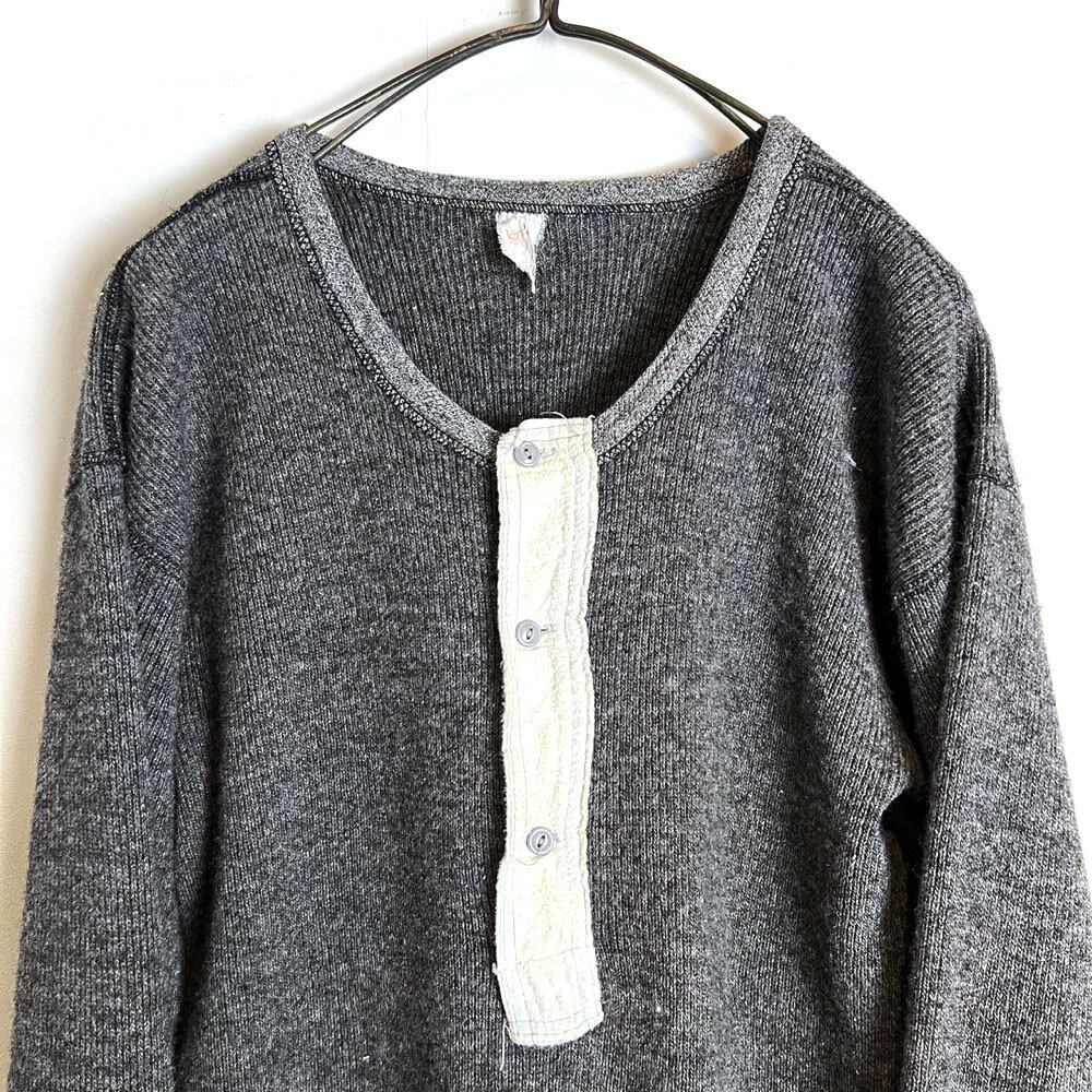 A Swedish military henley neck thermal shirt from the 1960s. A rough textured ribbed wool knit with a nice marbled charcoal color. It also looks great when worn as an inner layer.
